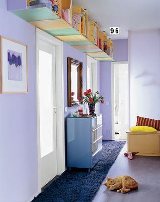Комод, сделанный из MDF, соответствует общему тону прихожей. Для пола (линолеум) и стен (краска) выбран приятный сиреневый цвет. Ковер немного темнее, но выдержан в той же гамме.
