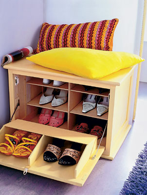 Эту низкую тумбу для обуви можно использовать как сиденье. Достаточно положить сверху декоративную подушку. Вместимость обувницы увеличивает откидная дверца с ячейками для туфель.