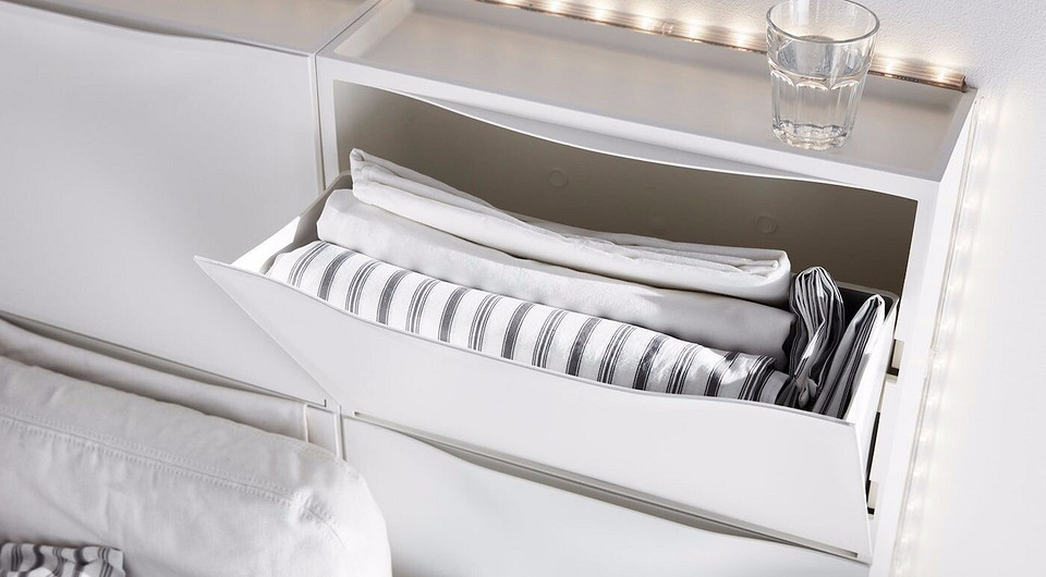 Внешне «Сконевик» похож на серию «Мальм», но внимательные отметят, что ящиков тут меньше, а верхний — меньше размером. Зато внешний вид практически идентичен, а белый цвет — еще и супер универсальное решение. Низкая цена обусловлена материалом — комод изготовлен из ДСП, ДВП и заламинирован.