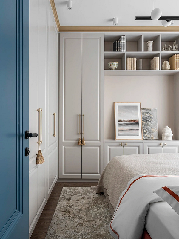В этой спальне реализовали сложную и в то же время элегантную систему хранения. Спроектировали встроенный угловой шкаф: вдоль стены слева от входа стандартного размера, напротив кровати — меньшей глубины. Также предусмотрели открытые секции. Здесь сосредоточено основное хранение, поэтому конструкция должна была быть разнообразной и подходящей под разные типы вещей. А за счет того, что шкаф встроенный и фасады совпадают по цвету с отделкой, крупная мебель не кажется массивной и словно растворяется в пространстве.