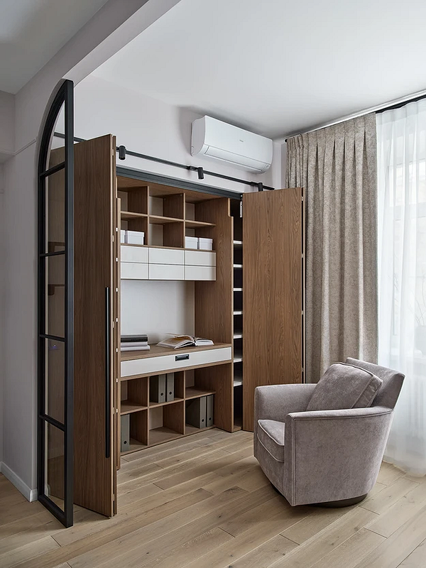 В оформлении этой квартиры дизайнер использовала различные трансформируемые системы. Самая сложная и многофункциональная — в гостиной. Часть комнаты около окна отвели под хранение. Но это не просто шкафы, а мобильная конструкция, которая при необходимости превращается в рабочее место. Причем отдельно трансформируется сам стол: если основной поверхности не хватает и, например, нужно поставить ноутбук либо разложить книги, можно выдвинуть дополнительную столешницу. Вокруг — полки для хранения документов и прочих вещей.