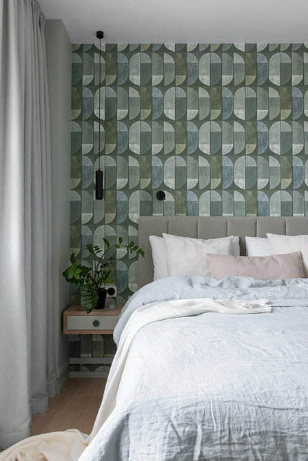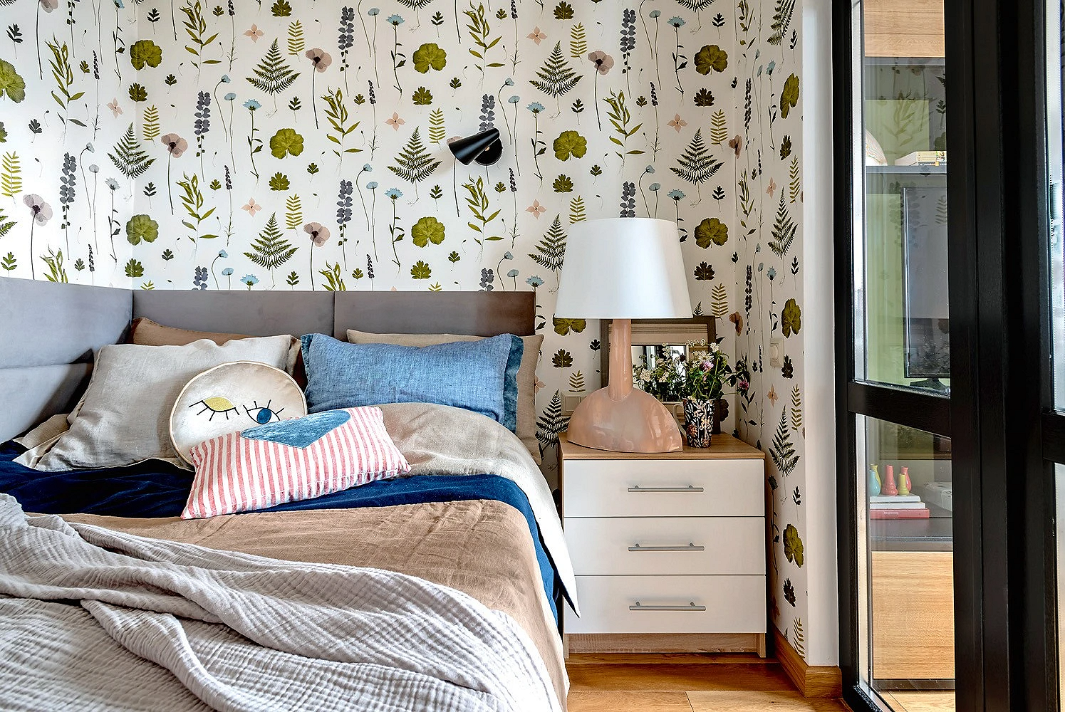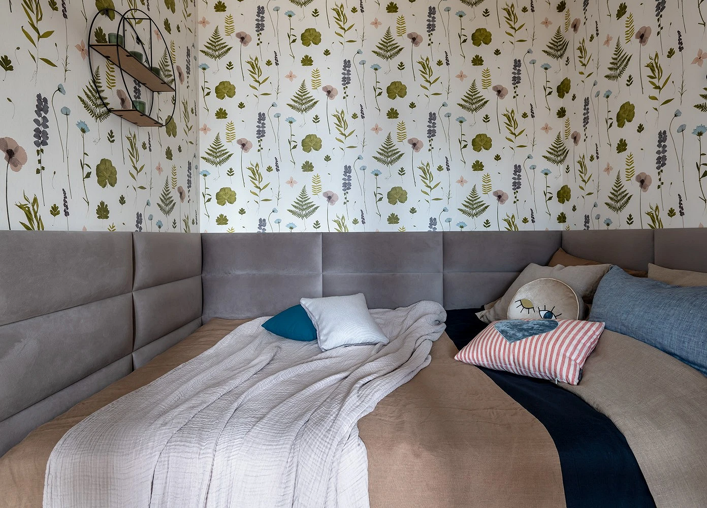 В этой спальне, несмотря на очень маленькую площадь (всего 5,5 кв. м), удалось оформить функциональный и красивый интерьер. На стенах — акцентные обои с ботаническим рисунком, палитру которых поддерживает текстиль. Кровать с мягкими стенками сделали на заказ ровно под размеры комнаты, оставив место для тумбы с ящиками и вместительного платяного шкафа. Благодаря лаконичному оформлению фасадов он выглядит практически незаметно. Рядом с кроватью также есть два светильника: один на прикроватной тумбочке, а другой, поменьше, закреплен на стене. Получилась удобная подсветка для разных зон.