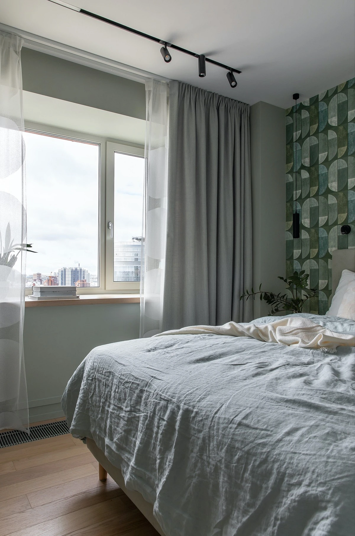 В этой небольшой однушке спальню отделили от общей гостиной с помощью стеклянной перегородки. Таким образом удалось выделить две полноценных зоны, не перегружая маленькую квартиру глухими простенками. Палитра построена на комбинации нейтральных природных оттенков, которые вместе создают гармоничный и спокойный интерьер, — то, что нужно для комнаты отдыха. А естественный свет из окна делает небольшую спальню визуально легче и просторнее. Кроме двуспальной кровати, здесь разместили кресло в качестве дополнительный зоны отдыха и прикроватные тумбочки. Подвесные модели выглядят невесомо и подчеркивают общее воздушное оформление спальни.