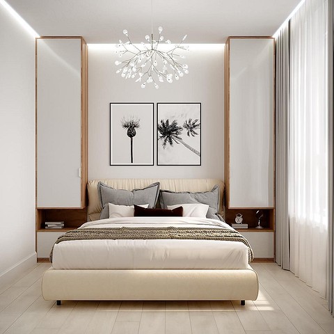 Широкое изголовье с небольшими нишами внутри — идеальное решение, если необходимости в шкафах и комодах нет, а побольше «воздуха» в комнате хочется.