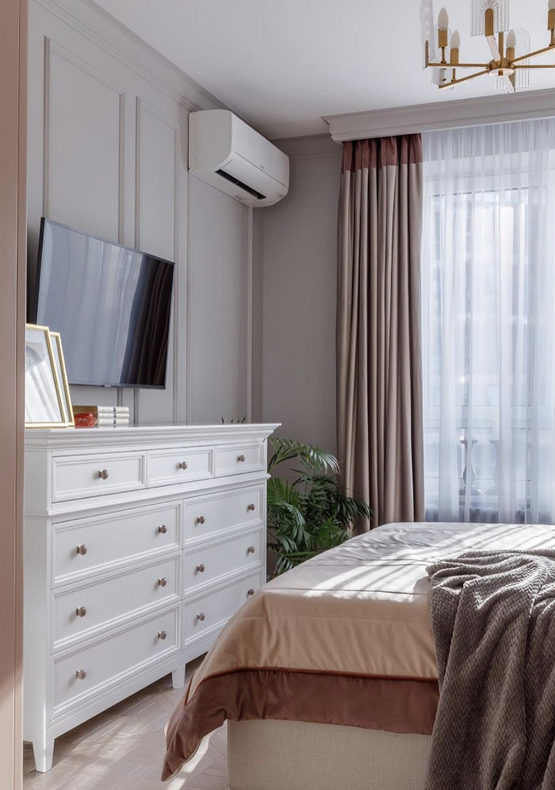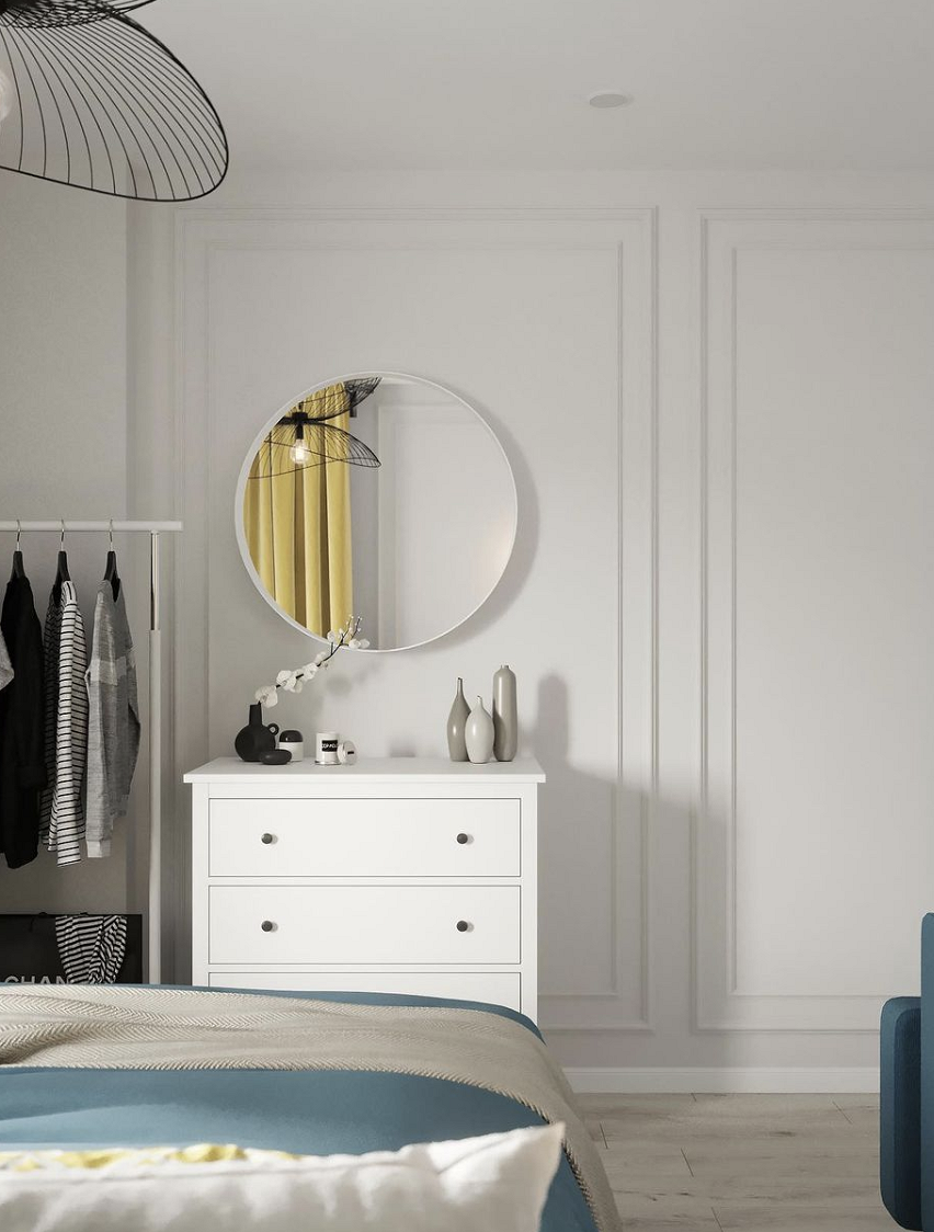 Например, это могут быть глянцевые или стеклянные фасады, золотистые ручки, различные декоративные вставки. Если хочется еще больше разгрузить интерьер, выбирайте подвесные или угловые модели без ножек и маленькой глубины — около 40-50 см. Комод с зеркалом в спальне тоже даст нужный эффект, но размещайте его так, чтобы отражение не смущало вас во время отдыха. Идеально, если оно будет находиться напротив кровати и отражать солнечные лучи. В целом на фоне светлой отделки может находиться мебель любого цвета: серого, бежевого, в пастельных тонах, насыщенных оттенков.