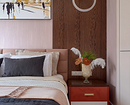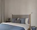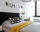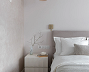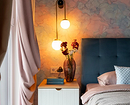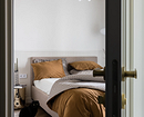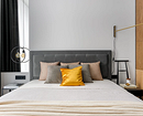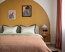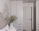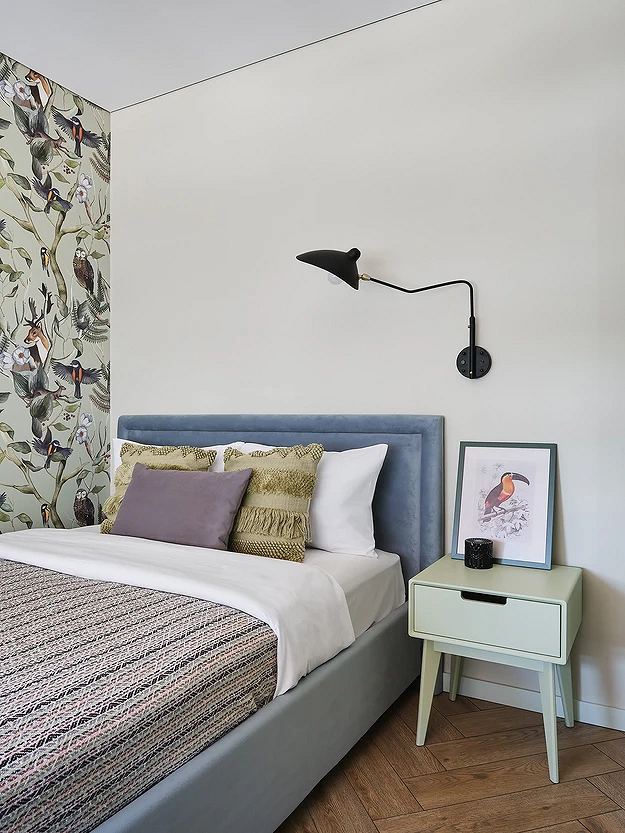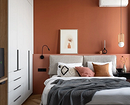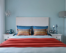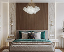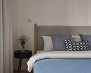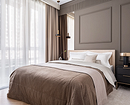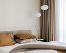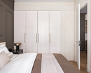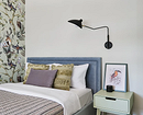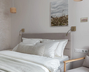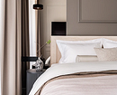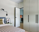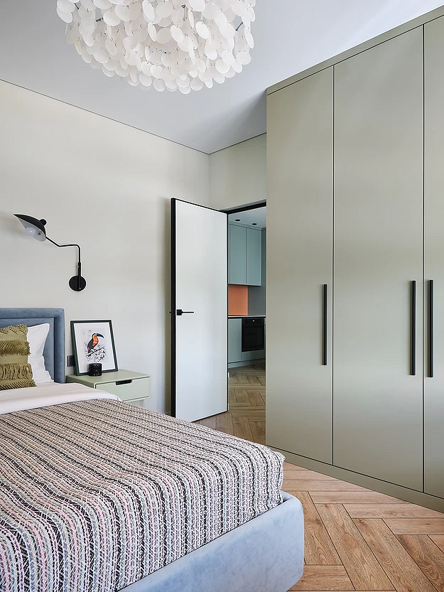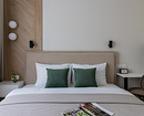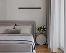 Нужно было разместить в комнате уже имевшуюся мебель: двуспальную кровать поставили по центру, напротив входа, а высокий комод — в углу у окна. Помимо последнего, авторы проекта предусмотрели еще несколько мест для хранения: вместительный шкаф с полками сбоку от кровати, тумбочки и узкую широкую консоль напротив спального места.