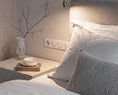 Традиционные лампы на прикроватных тумбах можно заменить настенными бра и таким образом освободить дополнительную поверхность. Также полезны светодиодные ленты. С их помощью подсвечивают стену в изголовье или потолочный карниз по периметру комнаты. Такой прием визуально увеличивает высоту потолка.