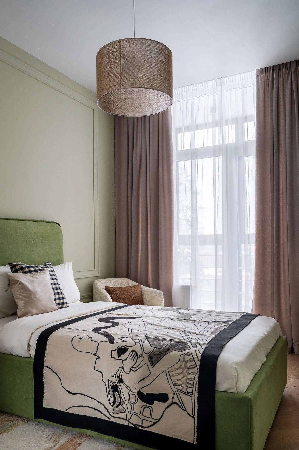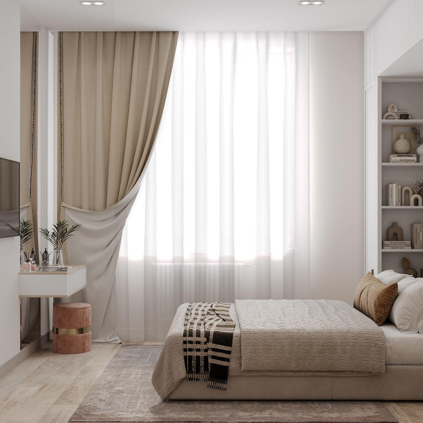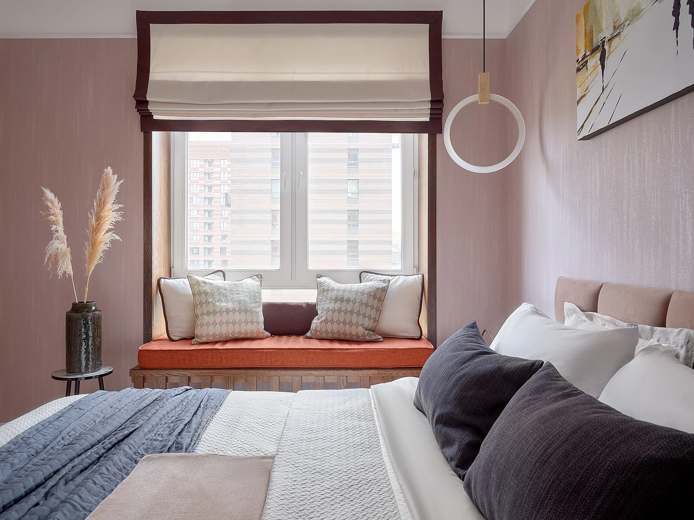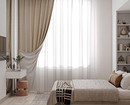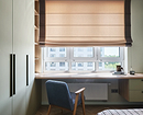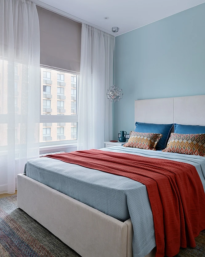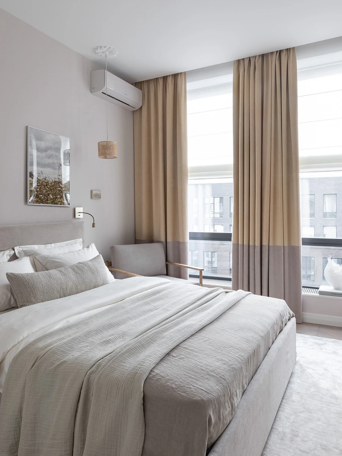 В небольшом пространстве лучше отказаться от слишком пестрого текстиля. Чтобы выдержать в интерьере минимализм, выбирайте лаконичные однотонные шторы. Отлично подойдут ткани блэкаут — так вы сможете защитить комнату от солнечного света и обеспечить себе комфортный отдых в любое время суток. От тяжелых портьер стоит отказаться в пользу современных римских штор или скомбинировать несколько видов оконного текстиля (римские шторы и легкие длинные портьеры, тюль и портьеры).