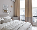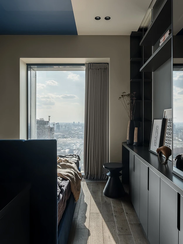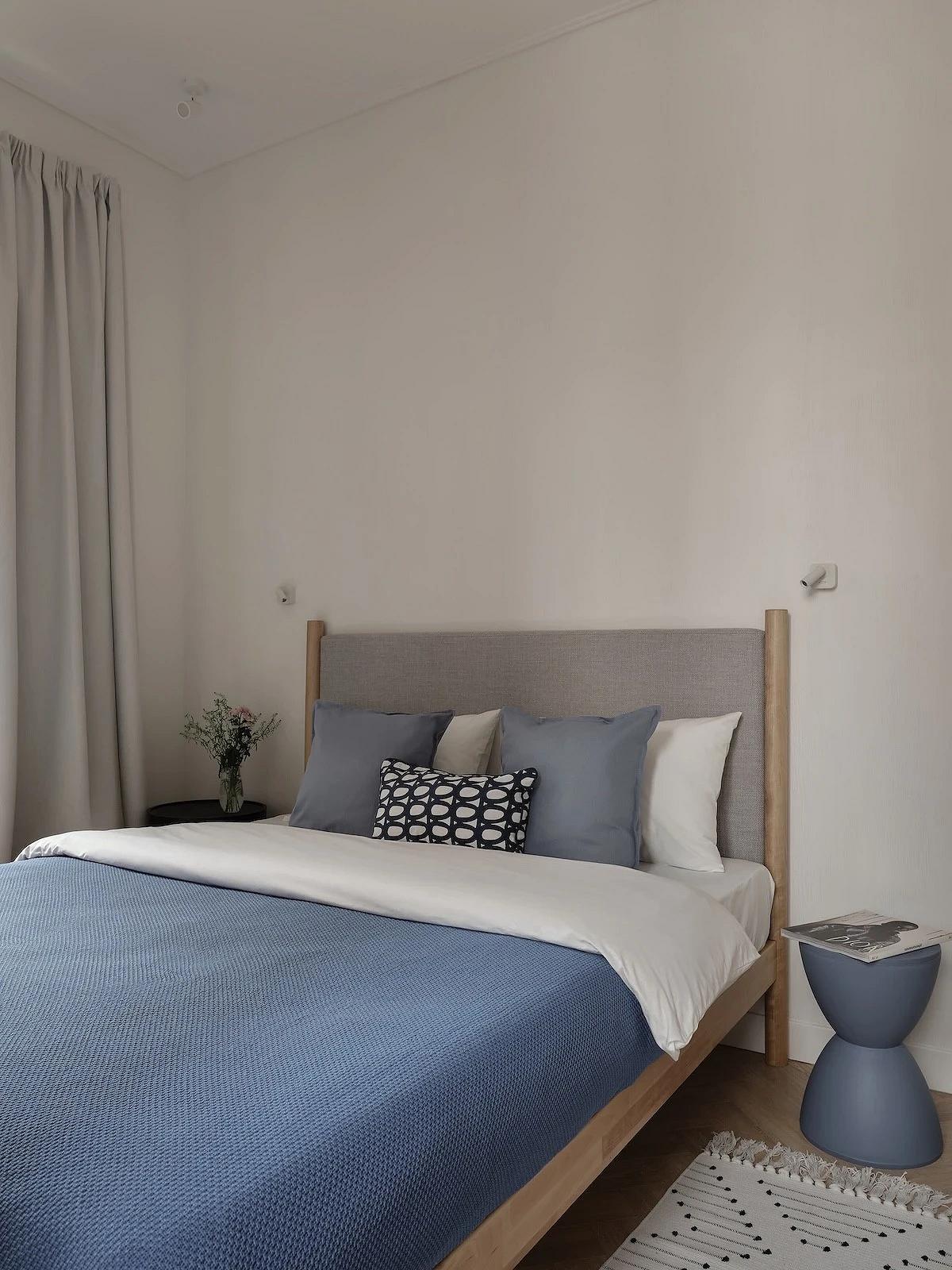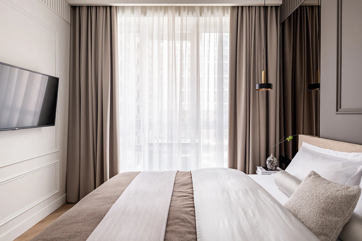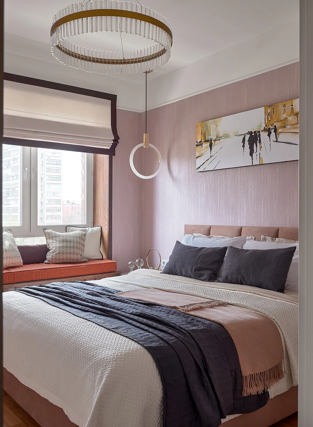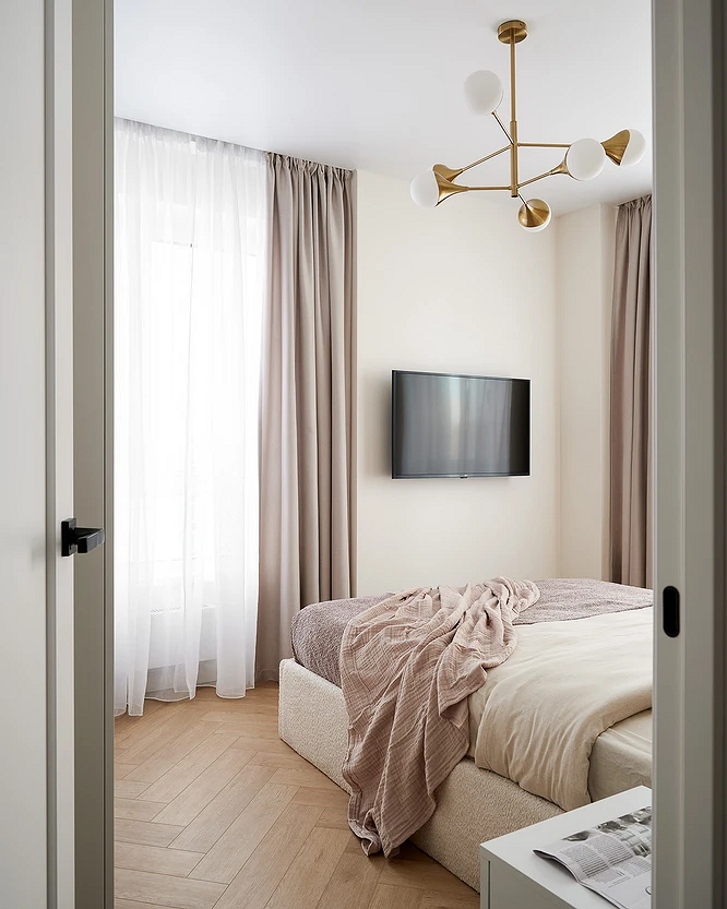 В небольшом пространстве лучше отказаться от слишком пестрого текстиля. Чтобы выдержать в интерьере минимализм, выбирайте лаконичные однотонные шторы. Отлично подойдут ткани блэкаут — так вы сможете защитить комнату от солнечного света и обеспечить себе комфортный отдых в любое время суток. От тяжелых портьер стоит отказаться в пользу современных римских штор или скомбинировать несколько видов оконного текстиля (римские шторы и легкие длинные портьеры, тюль и портьеры).