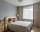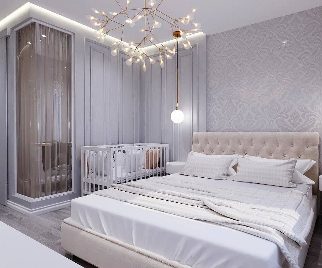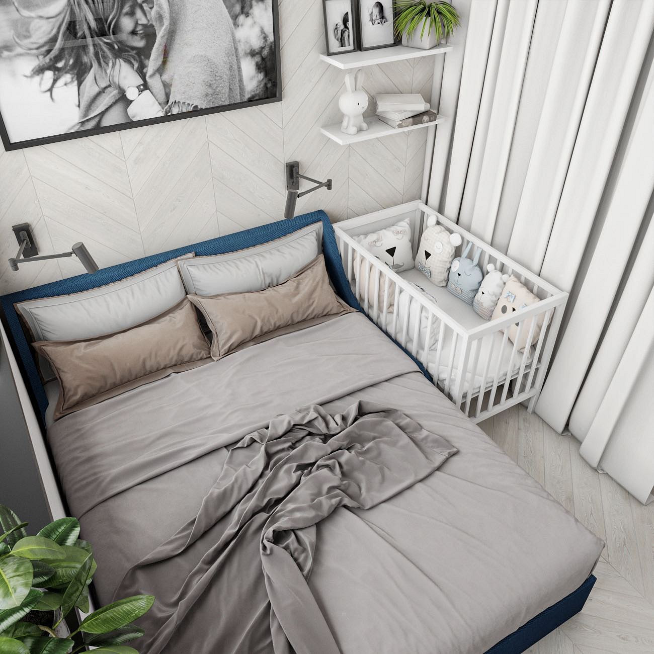 Даже при наличии в квартире детской родители часто решают поставить кроватку в своей комнате, пока малыш еще совсем маленький. Лучше, если кроватка будет располагаться не слишком близко к окну, чтобы ребенку не мешали сквозняки, шум и пыль с улицы, особенно если квартира на невысоком этаже. Обычно кроватку ставят вместо одной из прикроватных тумб или сбоку от родительской кровати. Обозначить зоны можно с помощью разных цветов и отделочных материалов, например, покрасить стену у кроватки другим цветом, повесить в детской зоне картину.