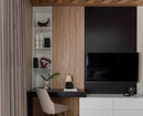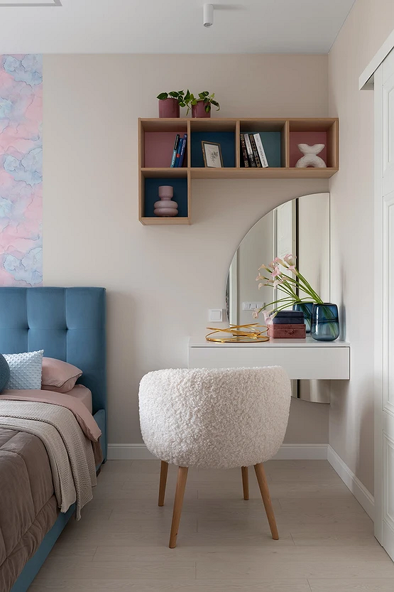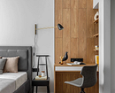 - В углу напротив кровати предусмотрели небольшое рабочее место с треугольной столешницей.