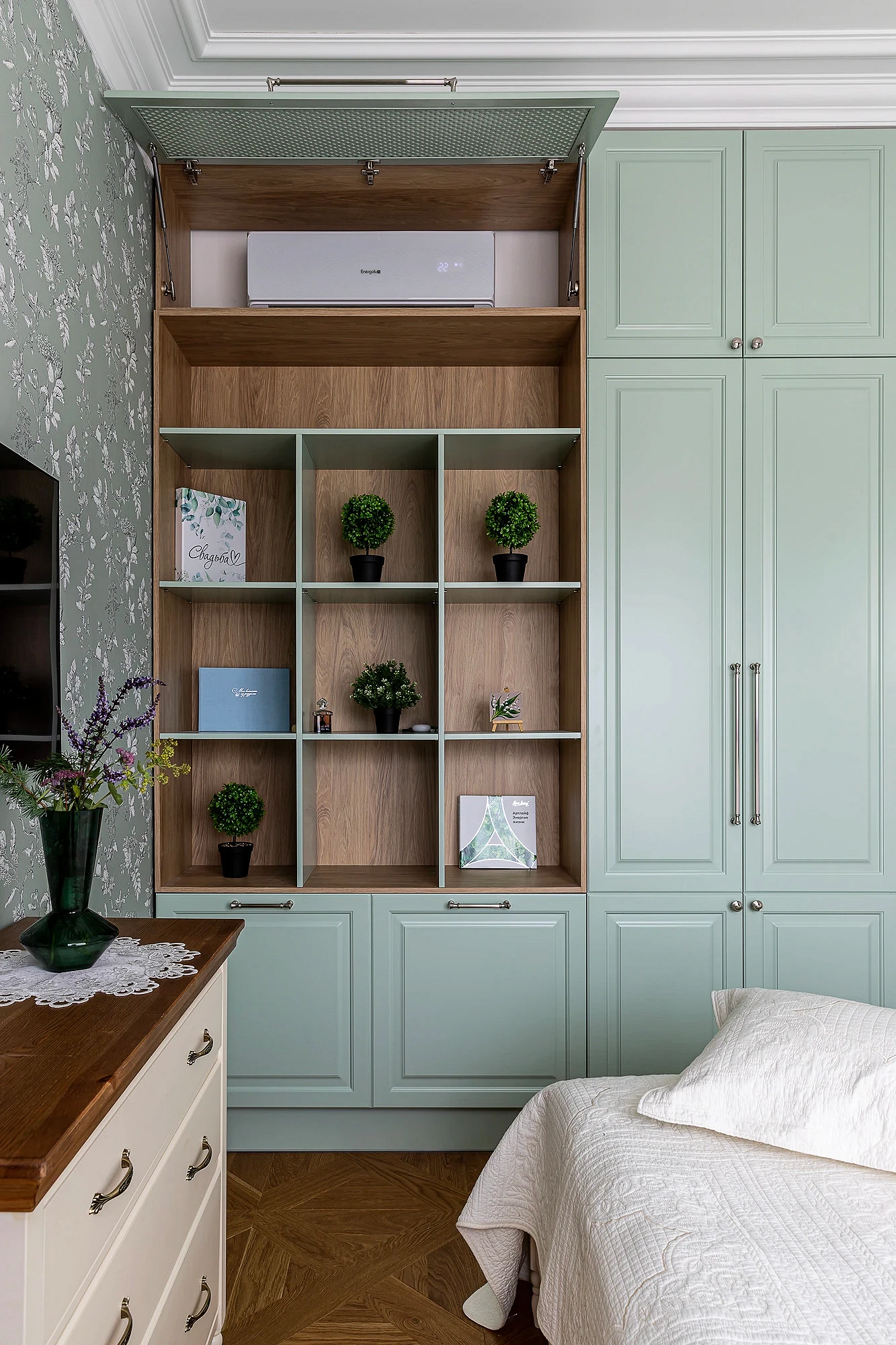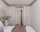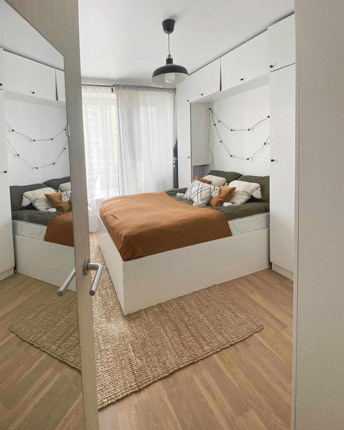 В маленькой комнате шкаф обычно располагают по стене сбоку от кровати. Выбирайте простые однотонные фасады без декора и рисунков. Идеально, если они будут оформлены в цвете стен, тогда объемная система хранения не станет визуально давить. Сейчас в моде отсутствие фурнитуры, когда дверцы оснащены специальными углублениями или открываются от нажатия. По-прежнему актуальны зеркальные двери-купе. Зрительно крупные отражающие поверхности делают комнату светлее и просторнее.