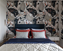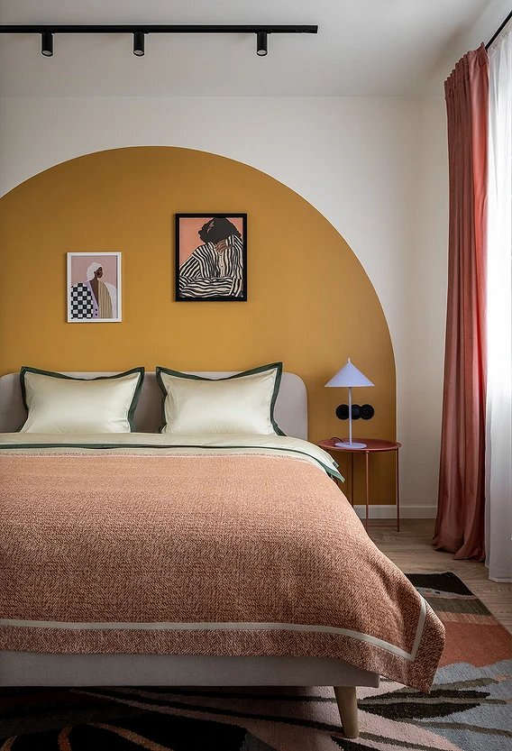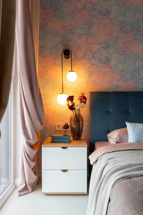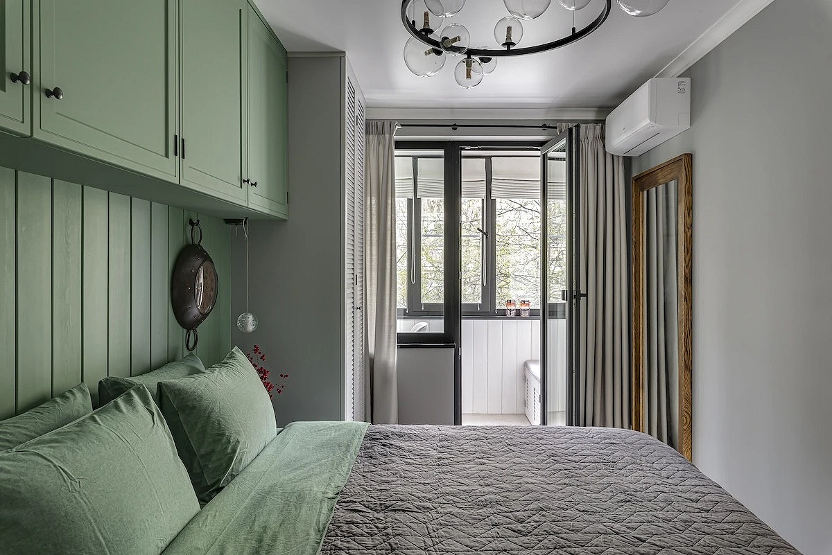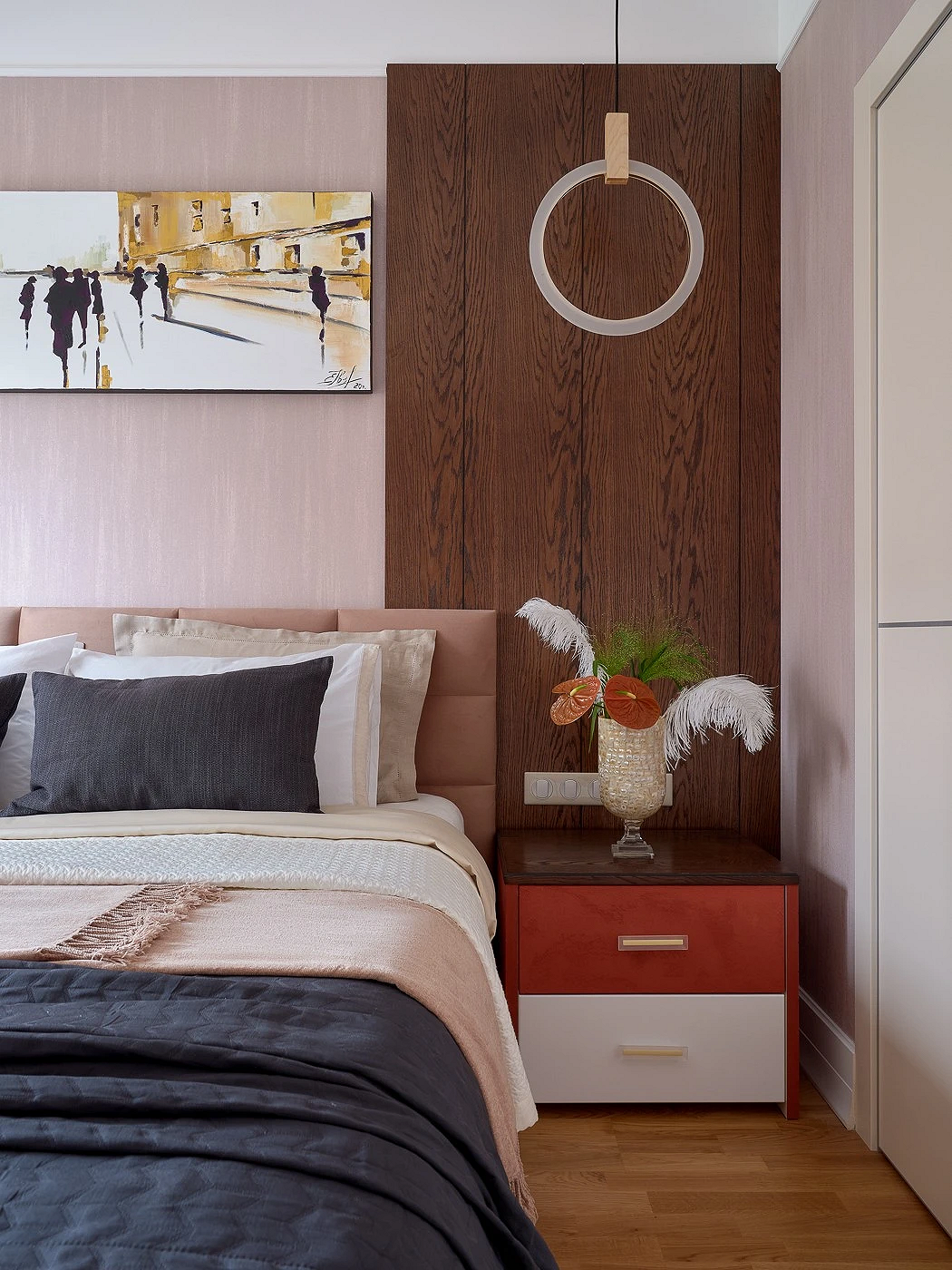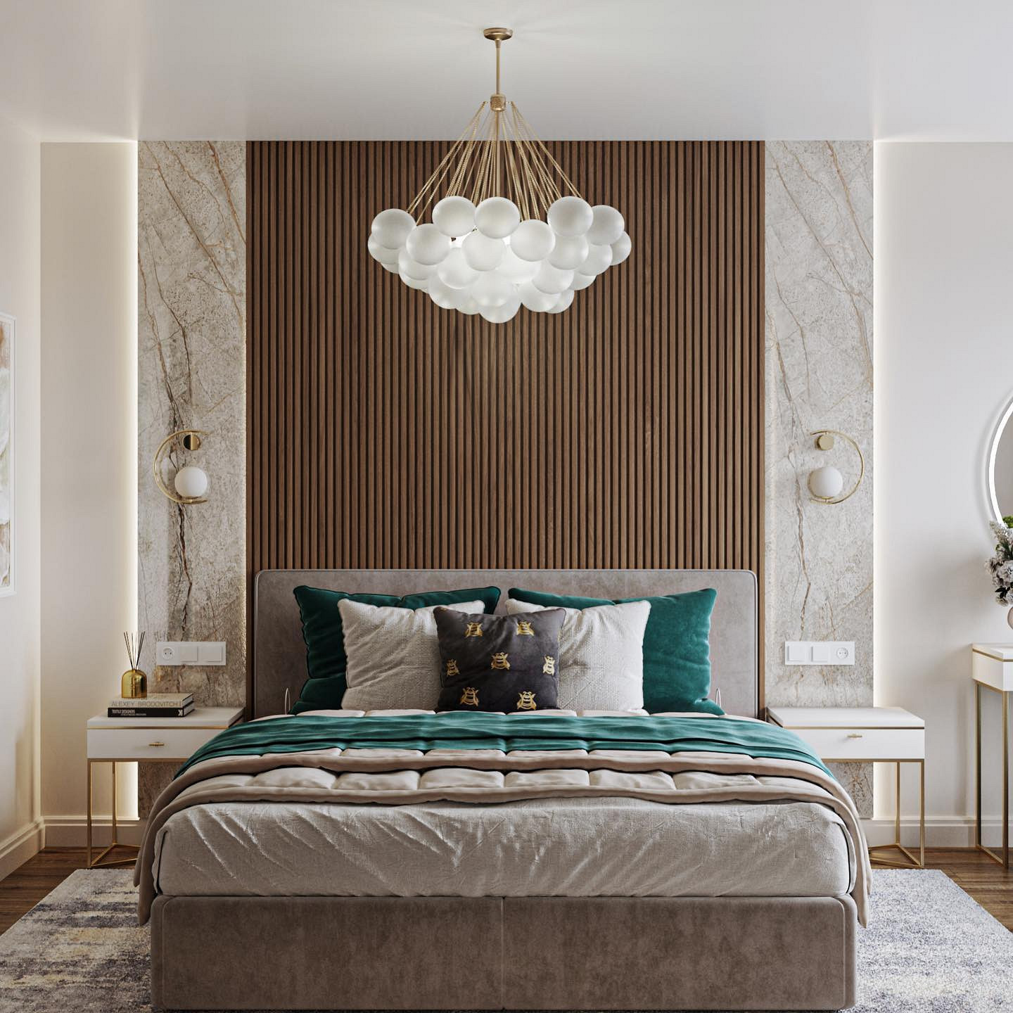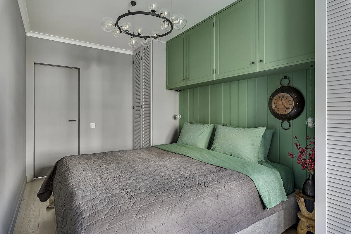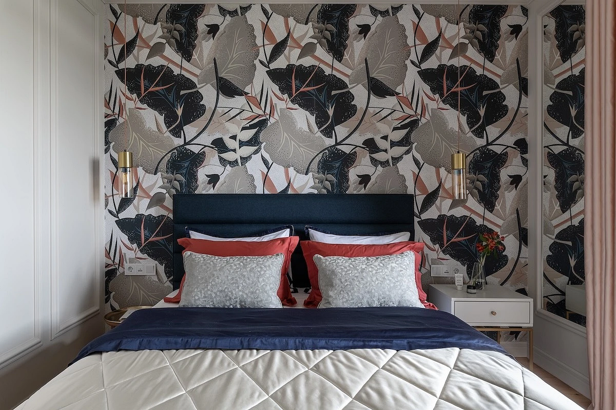 На небольшой площади лучше не использовать в отделке слишком темные цвета. Избегайте слишком ярких узоров орнаментов в оформлении стен — пусть они будут однотонные либо с неконтрастным рисунком. Чтобы разнообразить интерьер, можно сделать акцент в изголовье кровати. Также стены украшают молдингами и рейками. Кроме дерева, стену можно оформить МДФ или мягкими панелями. Делайте акцент только на одном участке, а остальные оставьте нейтральными.