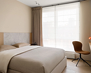 Это пример стандартной планировки комнаты с одной функцией. Не было необходимости размещать здесь рабочее место или много систем хранения — для этого при спальне предусмотрена гардеробная. Центром интерьера стала большая кровать. Напротив нее разместили ТВ-зону, тумбу поставили только с одной стороны. С другой поставили удобное мягкое кресло — получилась мини-зона отдыха.