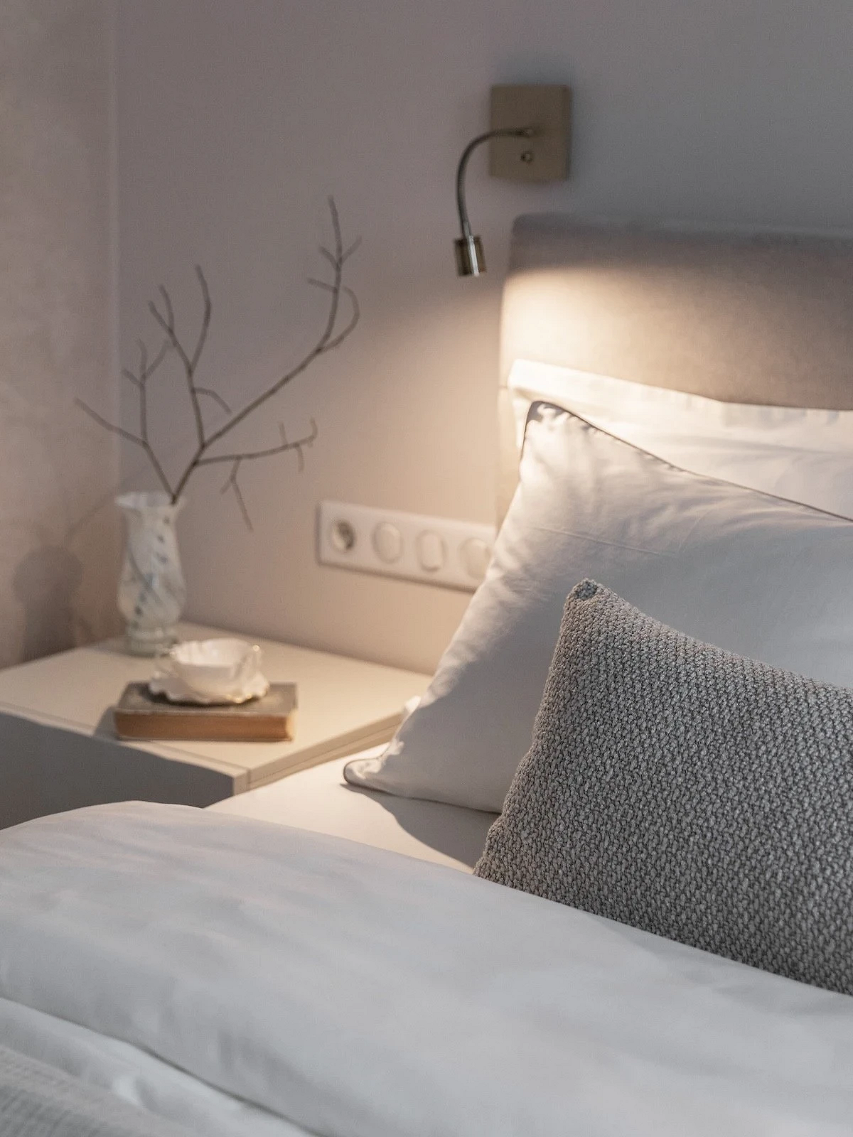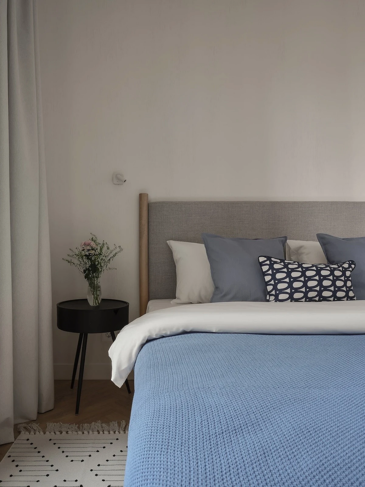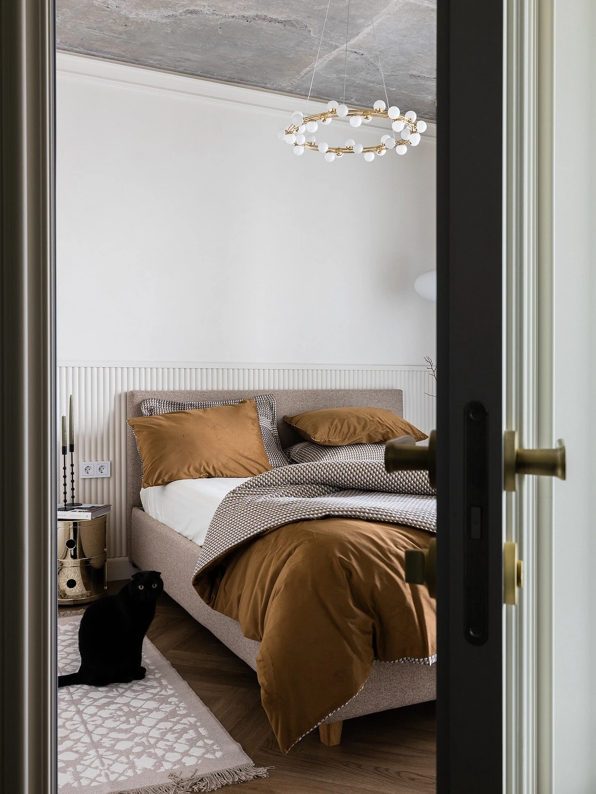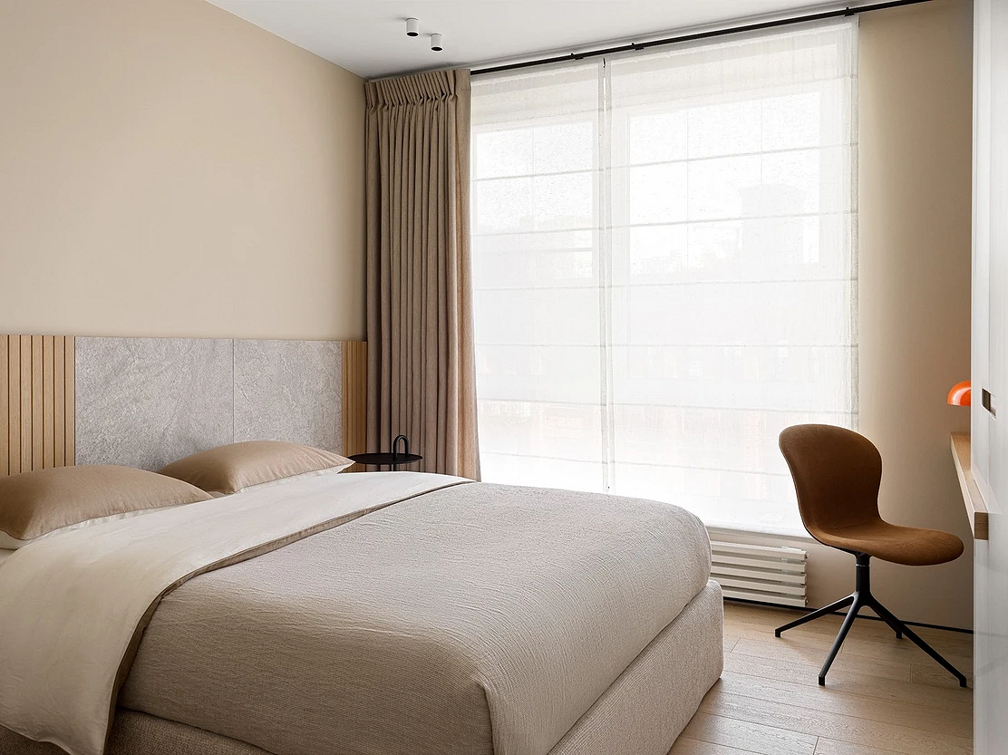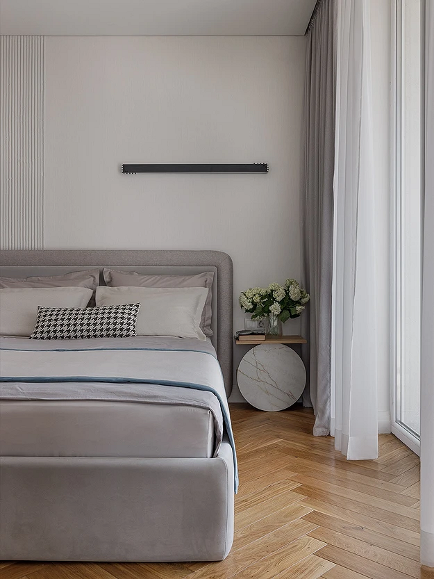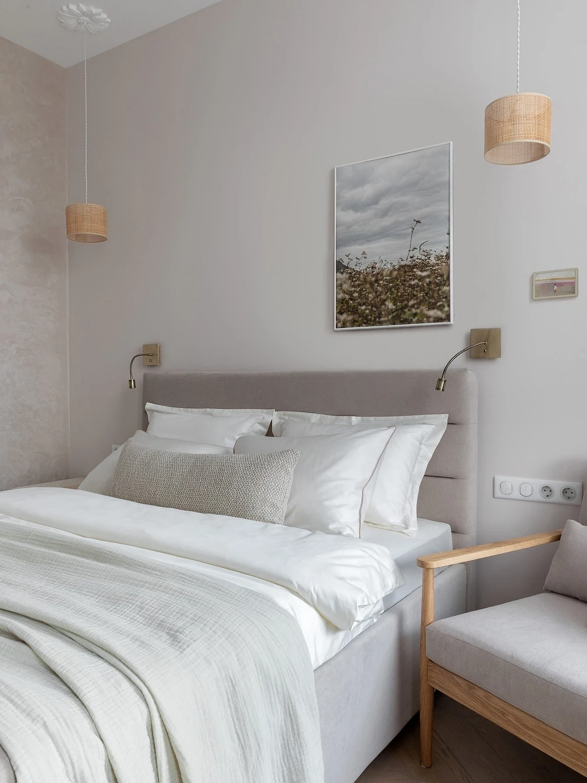 Чтобы не создавать визуальный шум, выбирайте однотонное постельное белье и покрывало нейтральных оттенков.