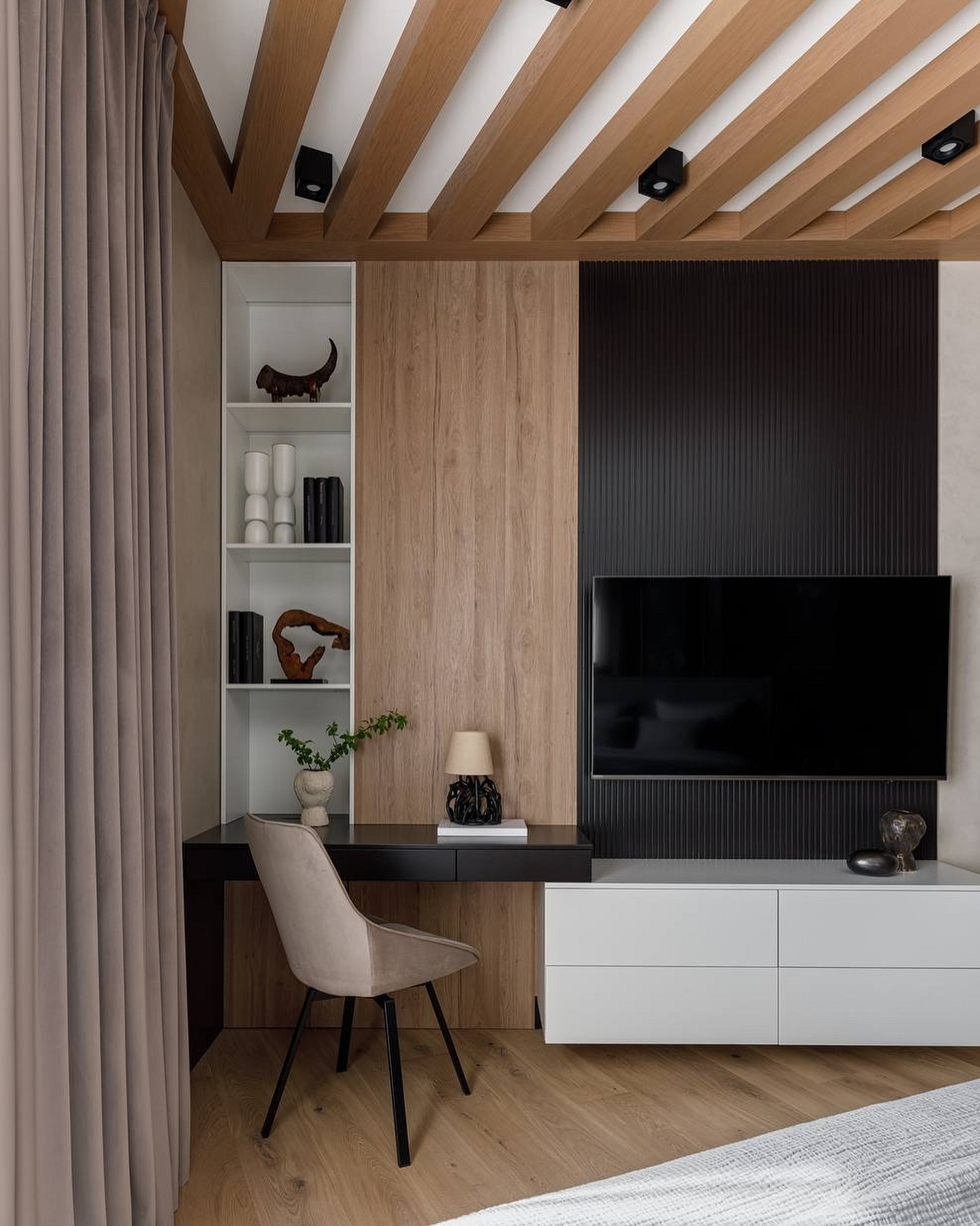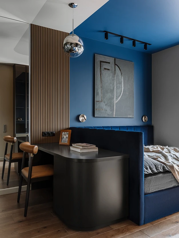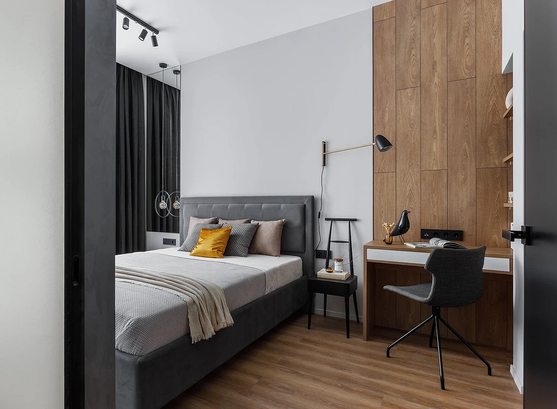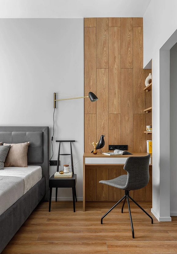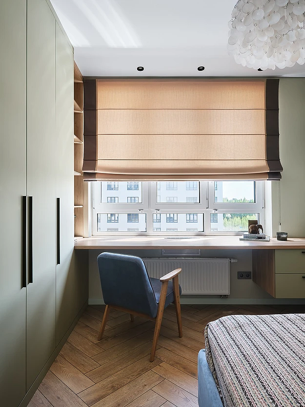 В квартире, где под кабинет не предусмотрено отдельное пространство, эту функцию нередко выполняет спальня. Вариант спорный: психологически может быть неудобно работать в месте, где вы спите. Зато в дневное время там легче обеспечить тишину и не отвлекаться на домочадцев.