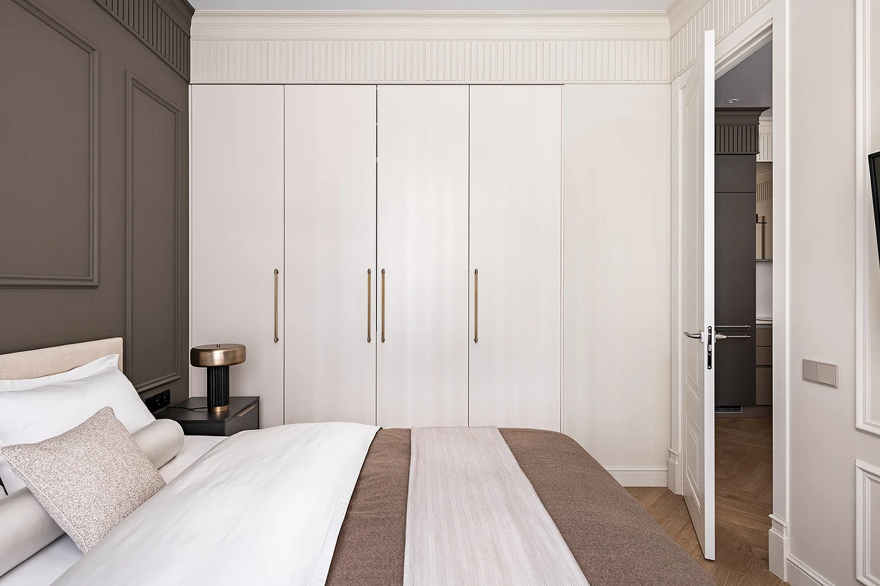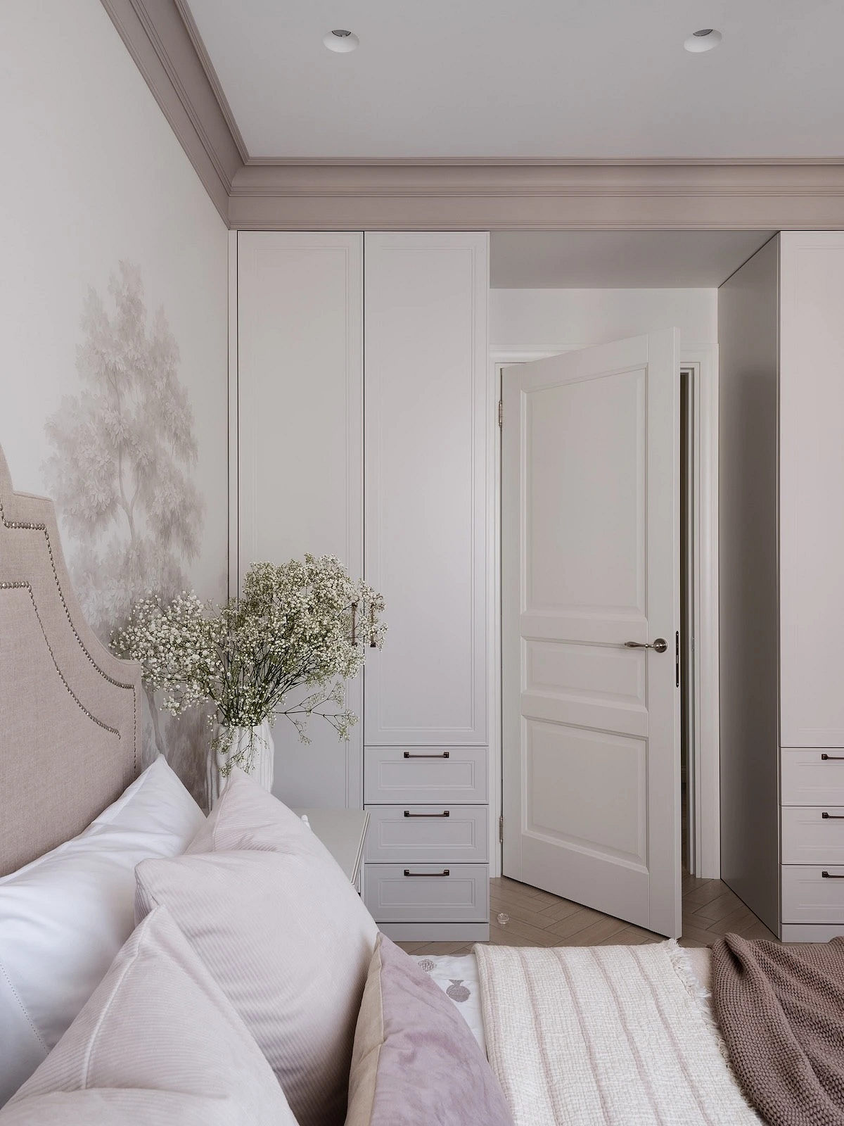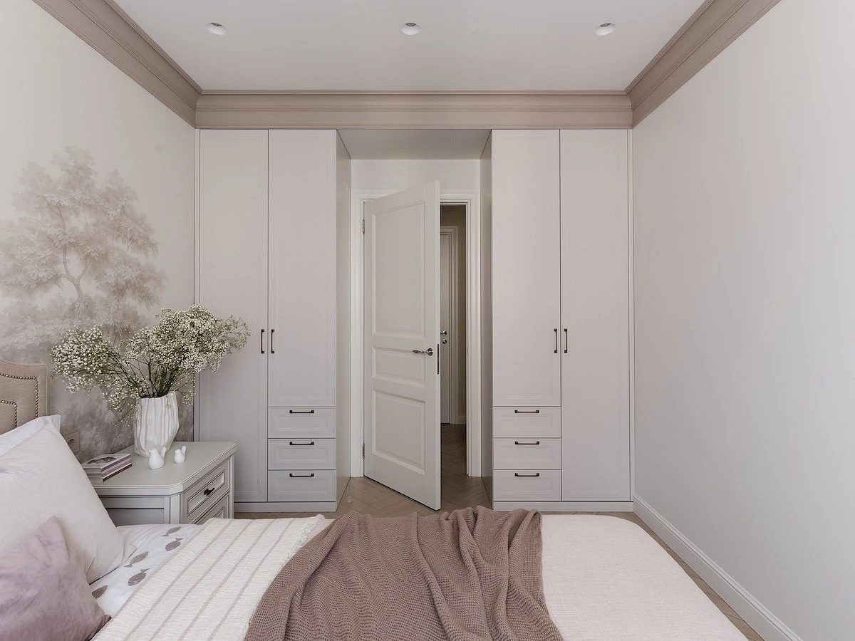 Один из вариантов обустройства вместительного хранения спальне 11 кв. м — П-образные шкафы вокруг двери или кровати. Чтобы конструкция не смотрелась массивно, выбирайте светлые цвета фасадов.