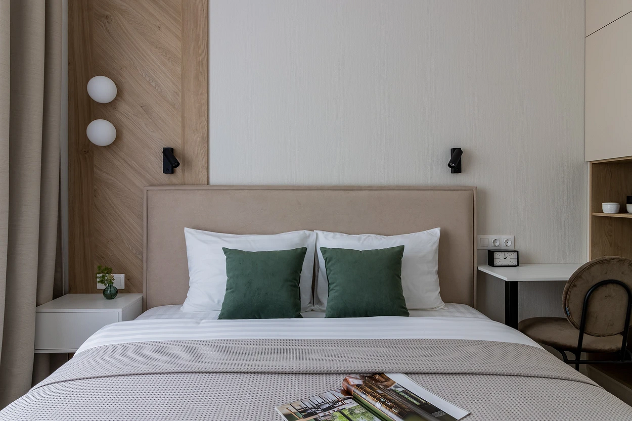 - По центру установили полноразмерную двуспальную кровать с тумбочками по бокам.