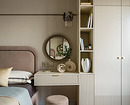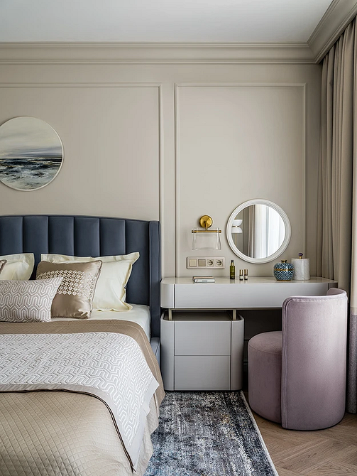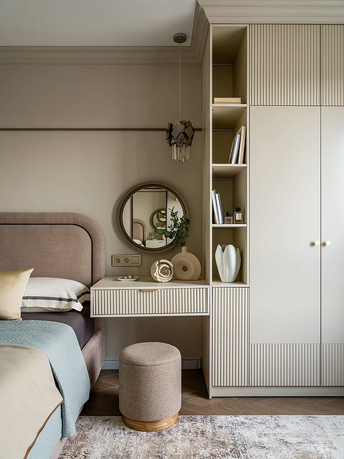 В изолированной комнате оставляют только кровать и дополнительную необходимую мебель: кресло для чтения, будуарный столик, комод или консоль для вещей. Даже основное хранение желательно вынести в гардеробную или незаметный встроенный шкаф.