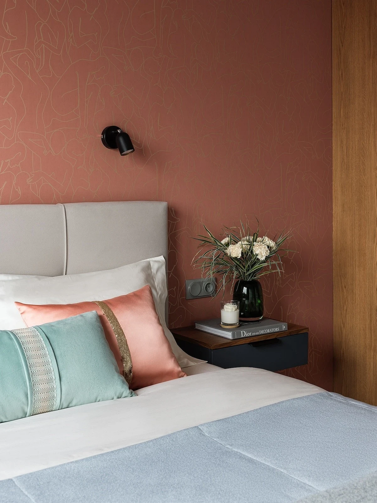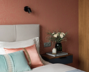 Терракота — мягкий глиняный оттенок, который добавляет комнате тепла, заряжает хорошим настроением и психологически воспринимается как комфортный располагающий цвет. Лучше всего раскрывается на матовых поверхностях, особенно с выразительной фактурой. Его дополняют теплым белым, бежевым, коричневым, а для акцентов выбирают графитовый, насыщенный синий или, например, фисташковый.