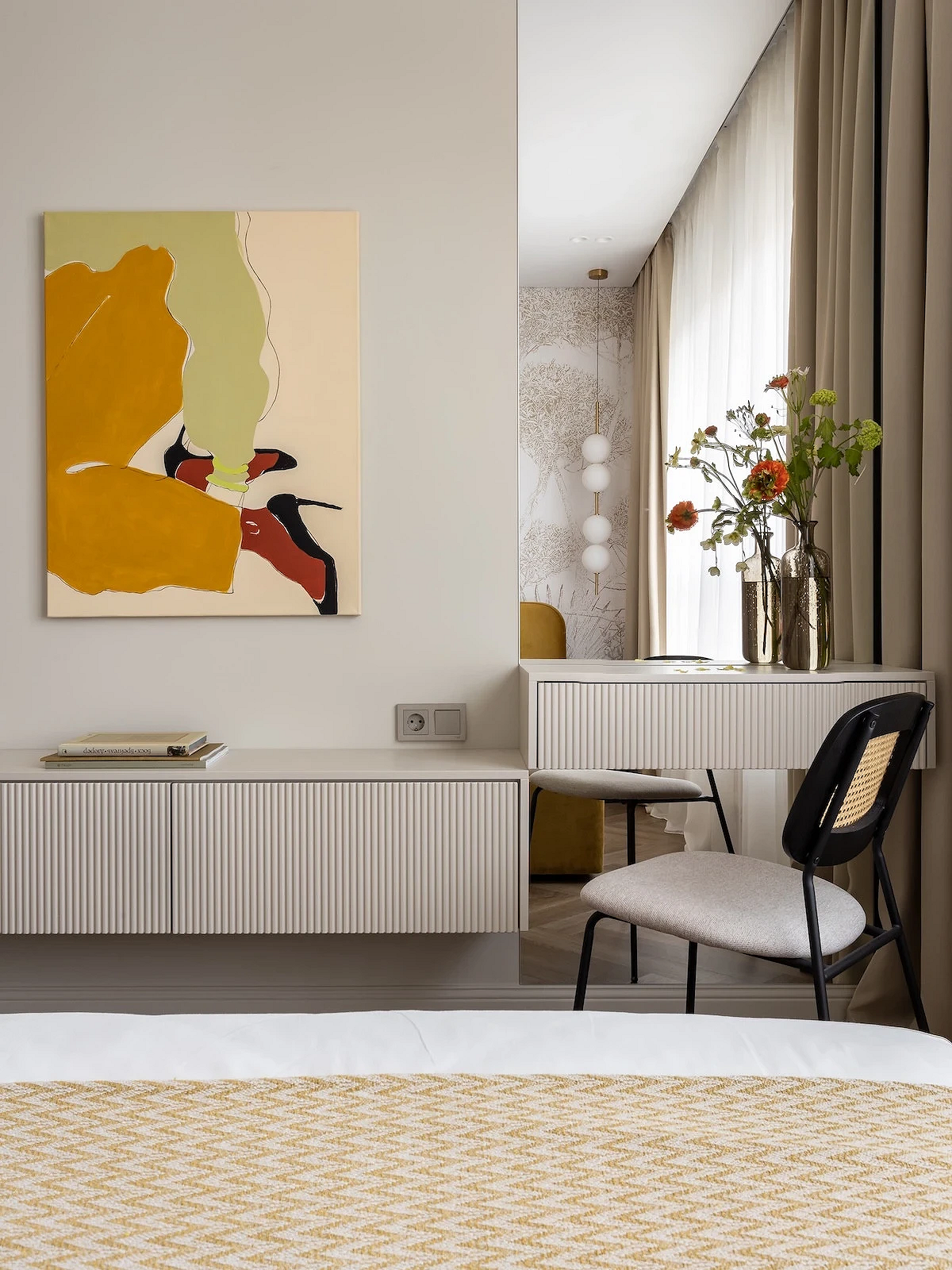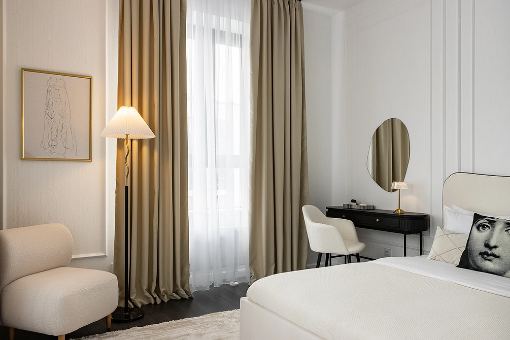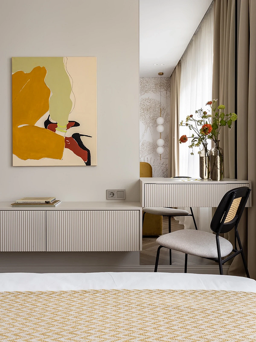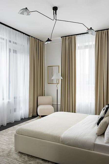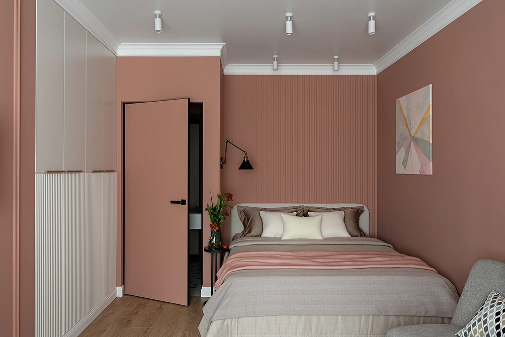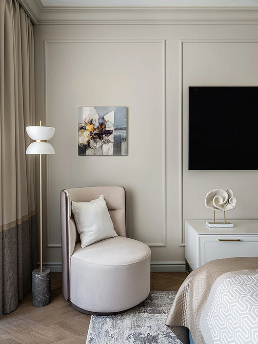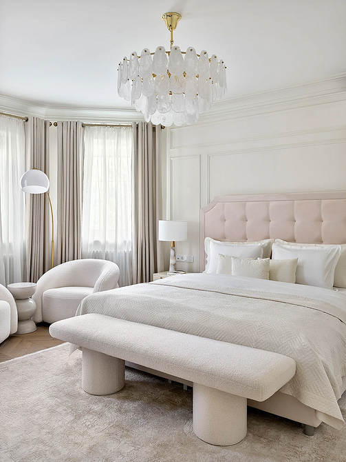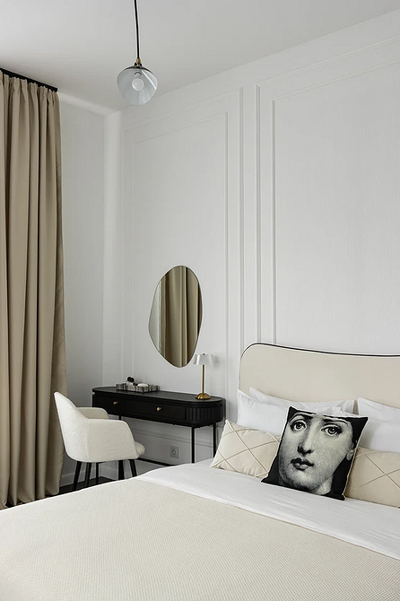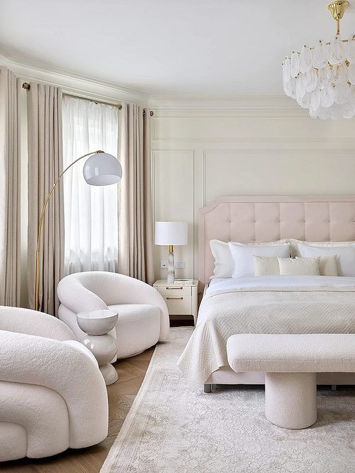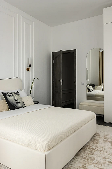 Молочный оттенок заменяет холодный белый. Он выглядит теплее и деликатнее, не создает эффект стерильности (что важно для спальни) и подходит для теплой монохромной палитры. Спокойный светлый оттенок работает как универсальная база: на его фоне хорошо смотрятся акцентная отделка, любая мебель и декор.
