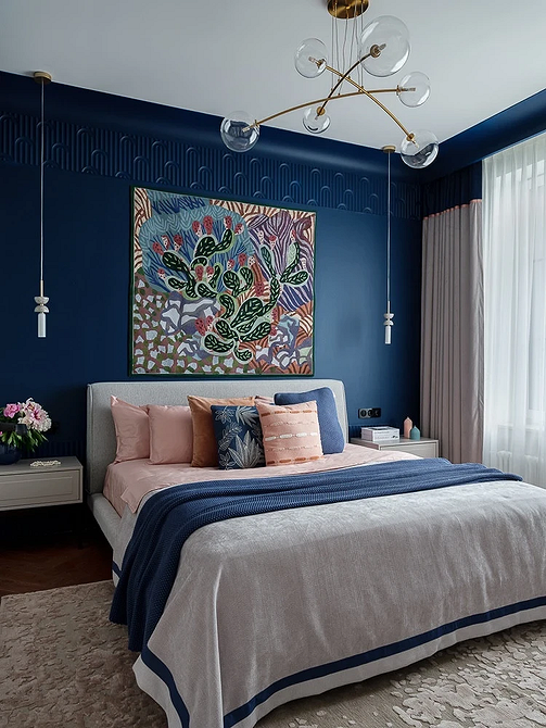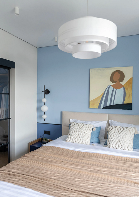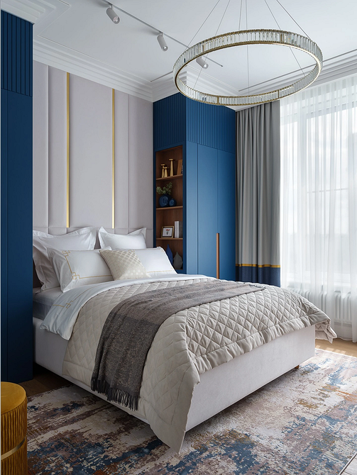 Сине-голубая гамма — главный тренд в интерьерной палитре 2026 года. Постепенно стереотипы вокруг них рассеиваются, и холодные сложные оттенки встречаются все чаще. В том числе — в спальне в противовес типичной теплой палитре.