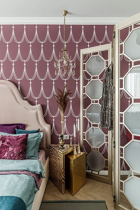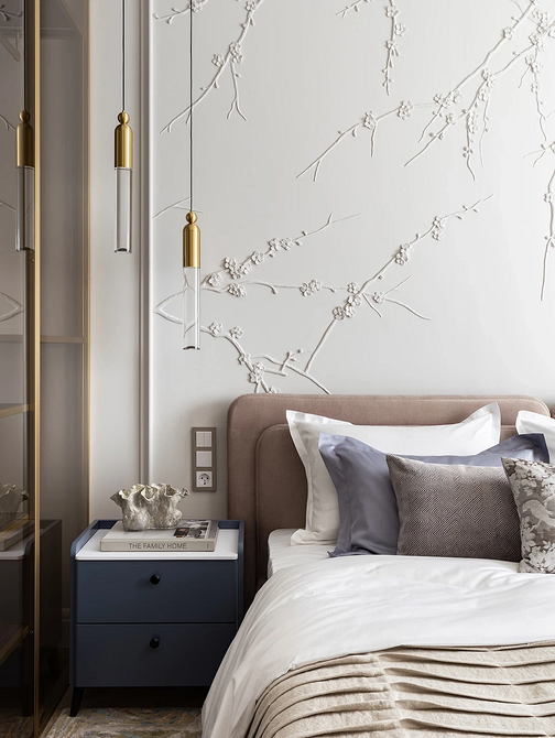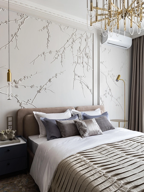 Такое оформление особенно актуально для минималистичной спальни, где нет ярких цветовых пятен и пестрых узоров, но хочется добавить обстановке декоративности. Это один из самых простых приемов для сдержанных монохромных интерьеров.