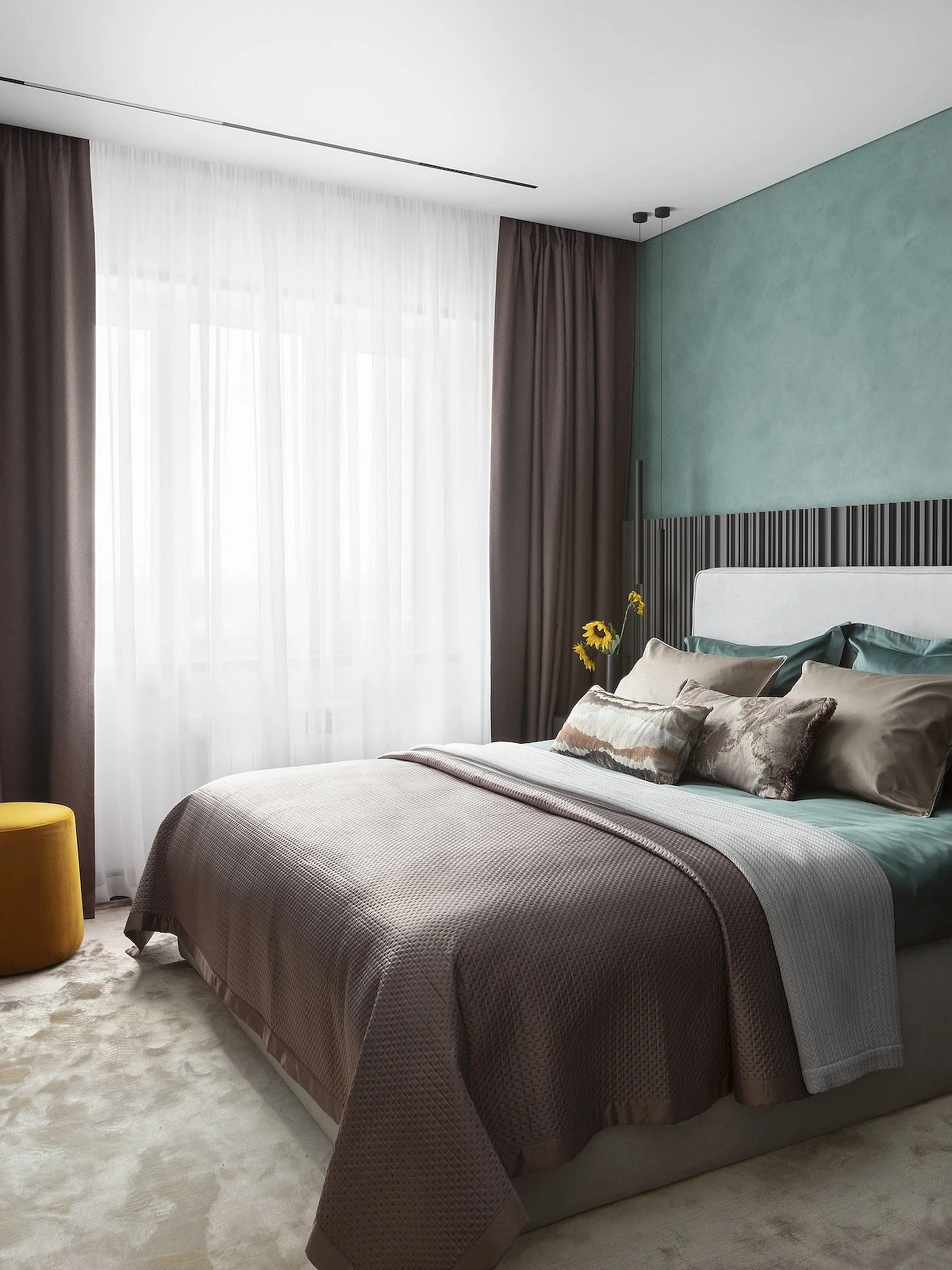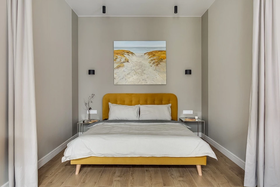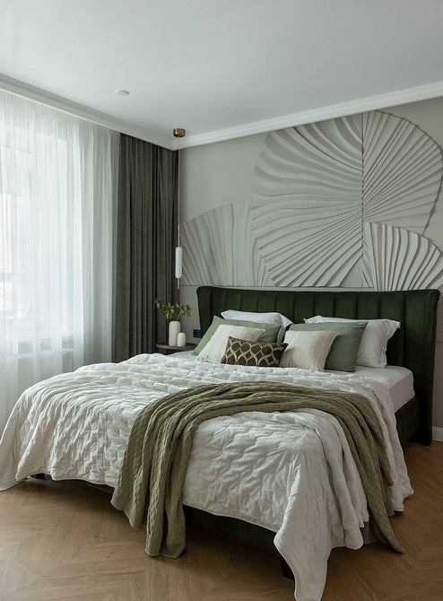 Песочный — уютный аналог классического бежевого с легким золотистым подтоном. Он визуально сглаживает углы и привносит в спальню ощущение солнечного света. На его фоне особенно выразительно смотрятся рельефные стены и фактурный текстиль.