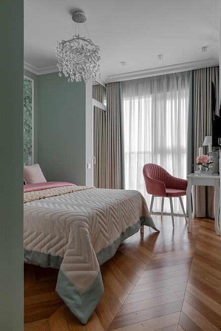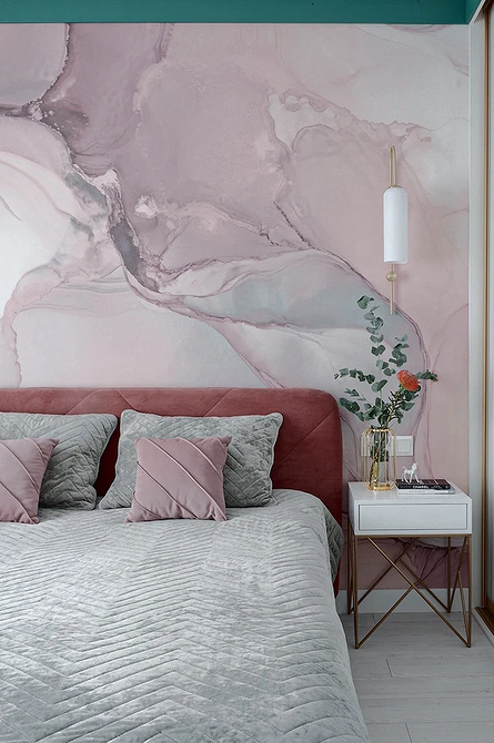 Спальня в светло-розовом цвете выглядит спокойно и уютно. Если окна выходят на северную сторону, дополняйте пастель фактурой дерева и теплыми цветами (бежевым, коричневым и т.п.). Если естественного света достаточно, можно, наоборот, сочетать розовый с серым, голубым, мятным или лавандовым.