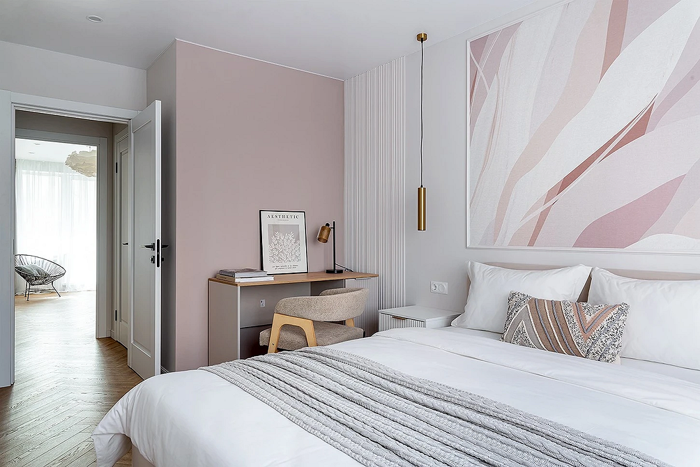 Бледно-розовый — это сложный нюансный тон с каплей серого или бежевого. Он не выглядит инфантильным и не воспринимается исключительно цветом «для принцесс». Может быть как основой палитры, так и дополнительным акцентом в сочетании с другими пастельными тонами.