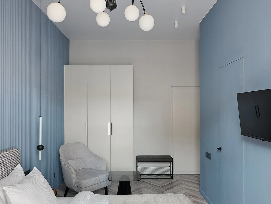 Голубые стены отлично подойдут для маленькой спальни: холодные тона создают визуальное ощущение большего расстояния, благодаря чему площадь кажется больше. А если хотите добиться ощущения камерности и глубины, выбирайте приглушенный синий для мебели, отделки или текстиля.
