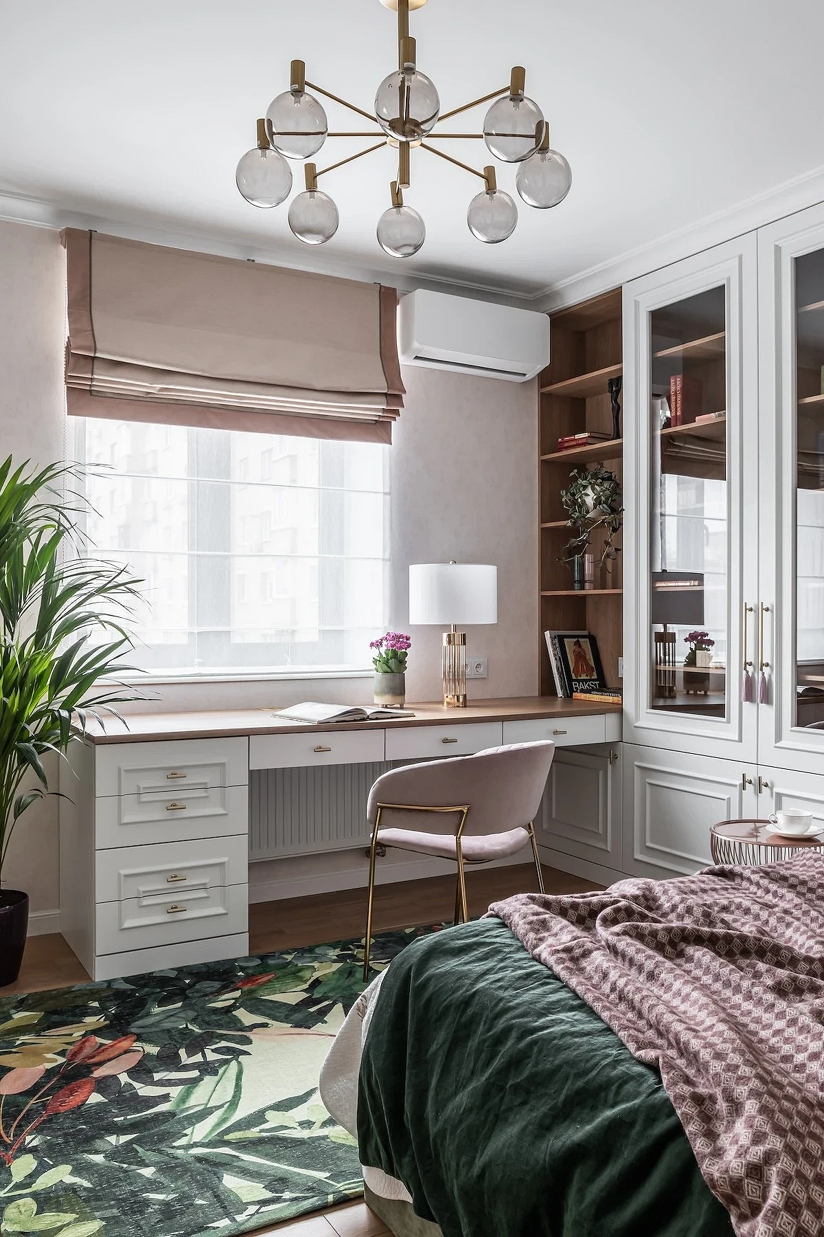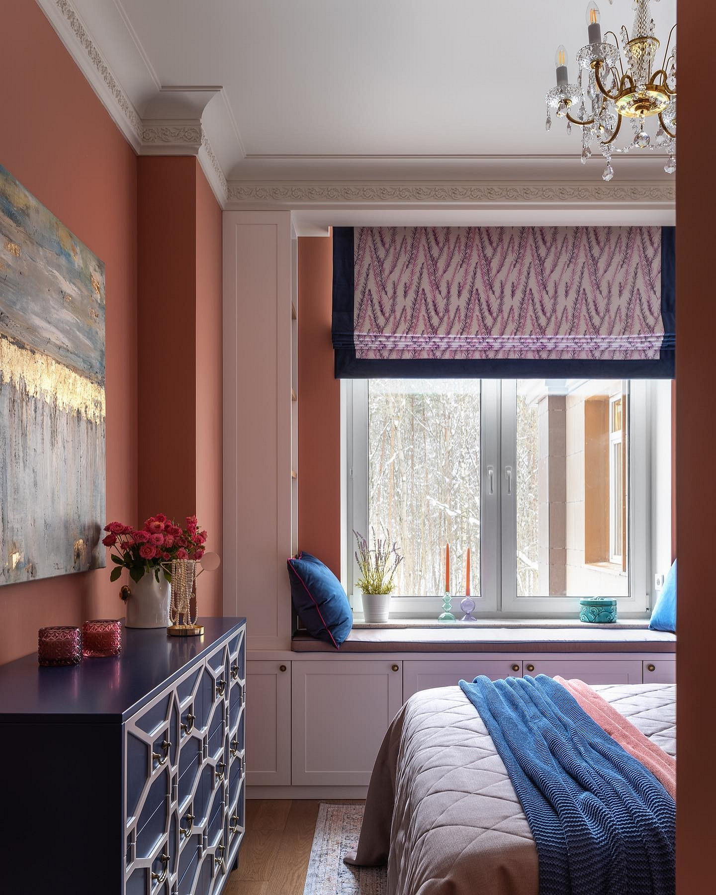 - Помните, что рисунок должен быть соразмерен размеру комнаты. Слишком крупный принт в маленькой спальне будет смотреться громоздко, привлекать внимание к окну и зрительно нарушать баланс. Слишком мелкий — потеряется, может рябить в глазах.