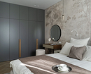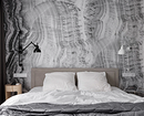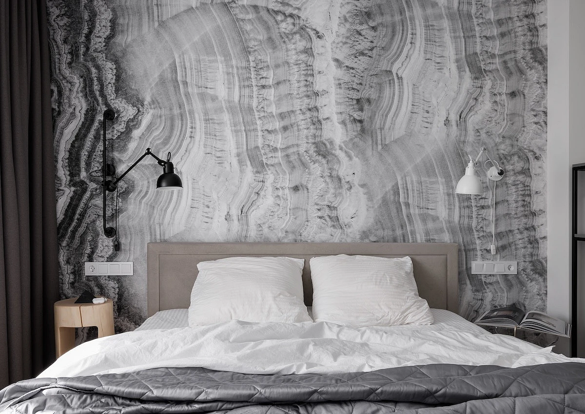Эта квартира в Санкт-Петербурге принадлежит зрелой семейной паре, которая много лет жила за Полярным кругом. Атмосферу севера решили воссоздать и в новом жилье, оформив его в духе скандинавского минимализма. Спальня продолжает общую концепцию и выполнена в той же ахроматической гамме. Как и в других комнатах, здесь есть акцентные обои. Стену за кроватью оформили полотнами с текстурой горных пород. Графичный серо-черный рисунок напоминает срез камня и отсылает к уникальной природе северных регионов.