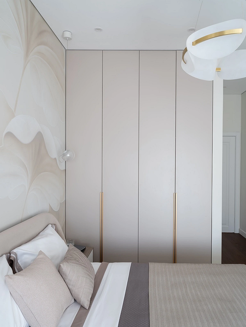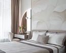 В этой спальне дизайнер использовала обои-панно ручной работы, которые стали источником вдохновения для всего интерьера. Плавные линии рисунка перекликаются с мягкими очертаниями мебели и светильников, а нежные кремово-бежевые оттенки визуально расширяют пространство. Крупный, но неконтрастный рисунок сделал стену за изголовьем кровати главным акцентом в комнате.
