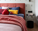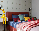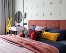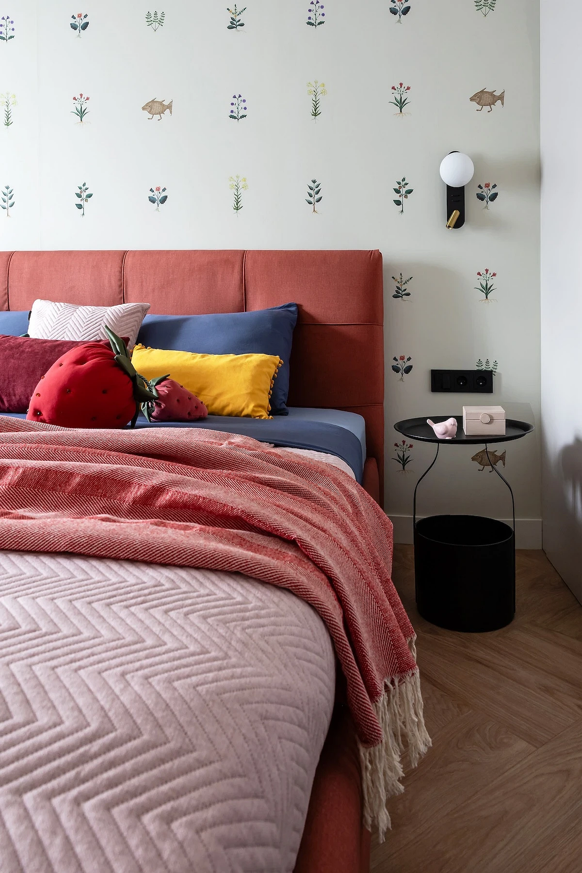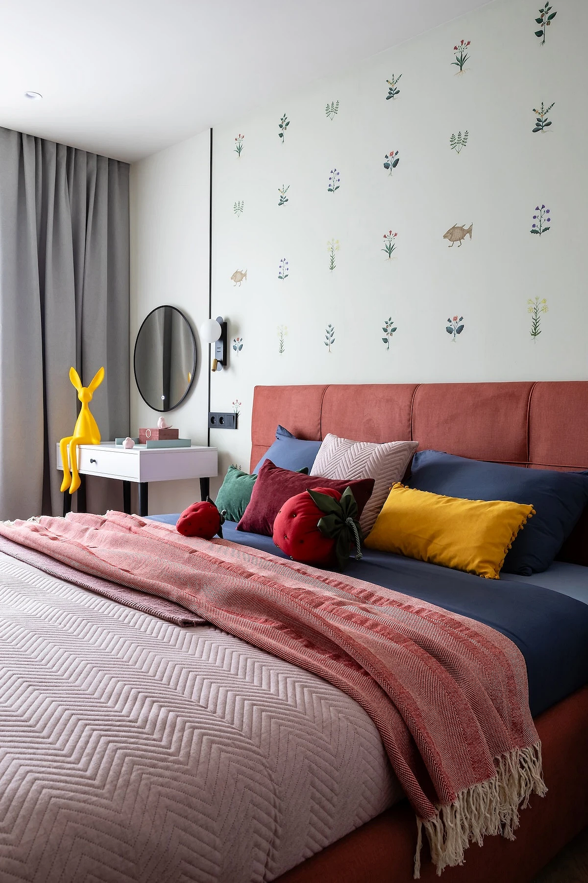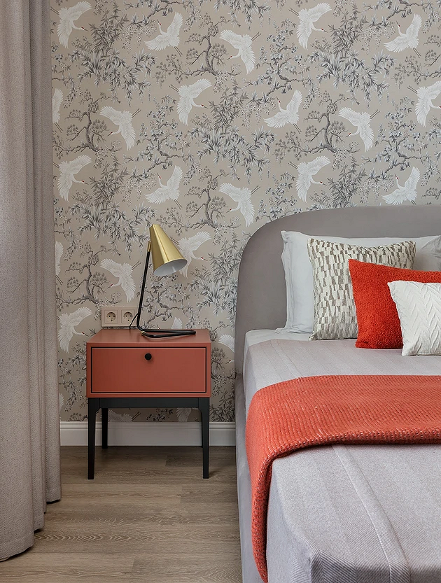 Эту хрущевку оформили для сдачи в аренду, но по просьбе хозяйки сделали не универсальный нейтральный, а яркий и запоминающийся интерьер. В каждой комнате — много цвета и оригинального декора, спальня не стала исключением. Светлые стены оживили обоями с забавным рисунком: цветами и фантазийными рыбами, у которых есть ножки. Орнамент не слишком плотный, благодаря чему отделка не выглядит аляповатой или перегруженной деталями. Фон остается светлым и спокойным, при этом его хочется рассматривать. А интерьер приобрел индивидуальность, как и хотела заказчица.