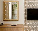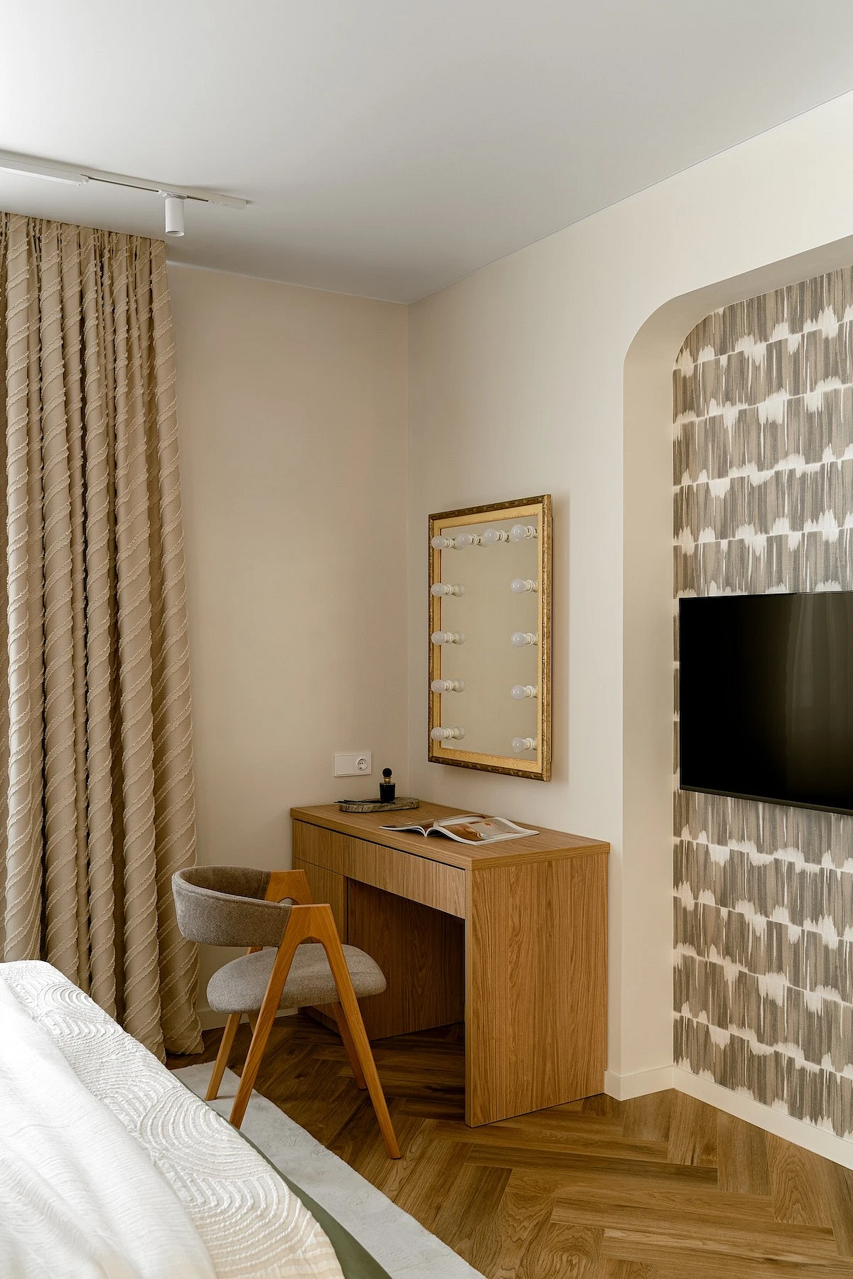 Чаще всего обои в спальне клеят за изголовьем, но это не единственное возможное решение. Например, здесь дизайнер выбрала для них участок напротив спального места. Обоями с ненавязчивым абстрактным рисунком отделали не всю стену, а только нишу с ТВ-зоной. Но это не все: тем же материалом оклеена и дверь скрытого монтажа. Когда она открыта, узор на обоях становится частью гостиной, перекликаясь с плиткой на колонне и тем самым связывая два пространства.