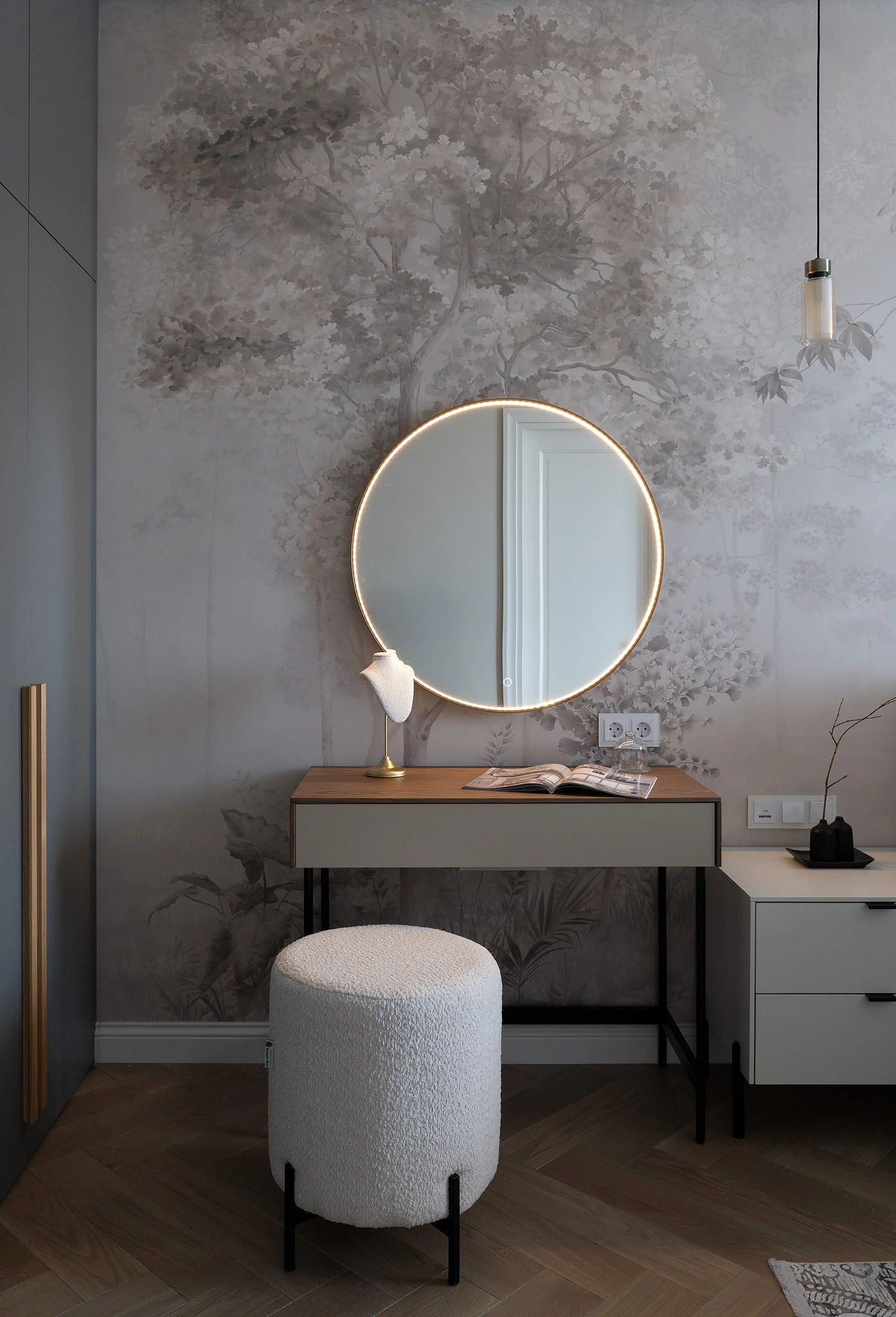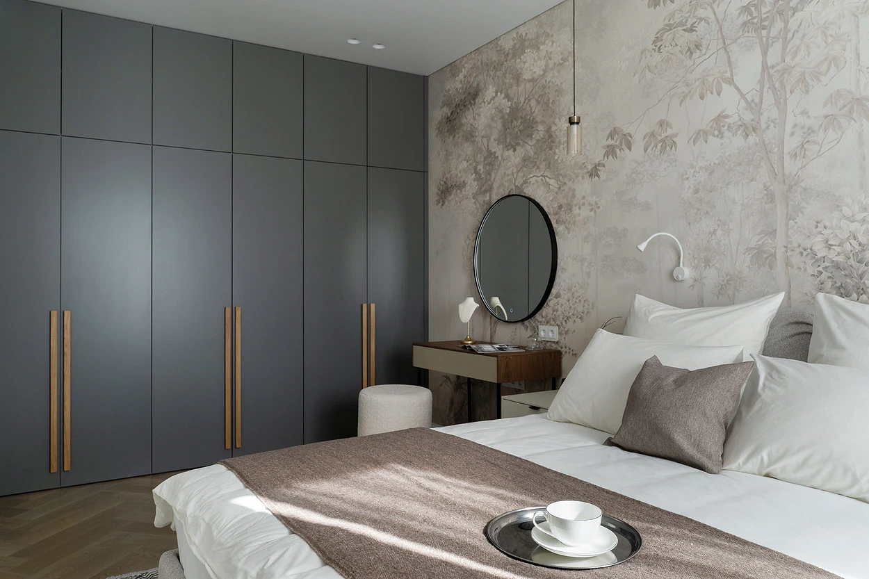 Интерьер этой отпускной квартиры для семьи выполнен в сдержанной современной классике. Все комнаты оформлены в нейтральной гамме, спальня — тоже. Для стены за изголовьем дизайнер выбрала сюжетные обои с изображением деревьев. Они лишь на пару тонов темнее фона, благодаря чему создается ощущение пейзажа в дымке тумана. Хочется лучшее рассмотреть каждую деталь, а масштабность панно (акцентная отделка занимает всю стену) и ощущение перспективы зрительно расширяют комнату.