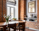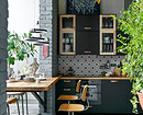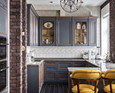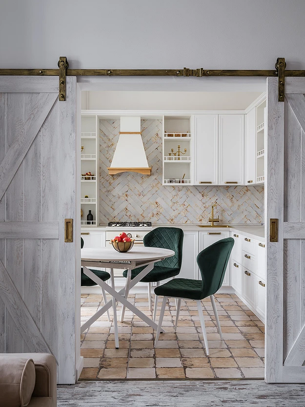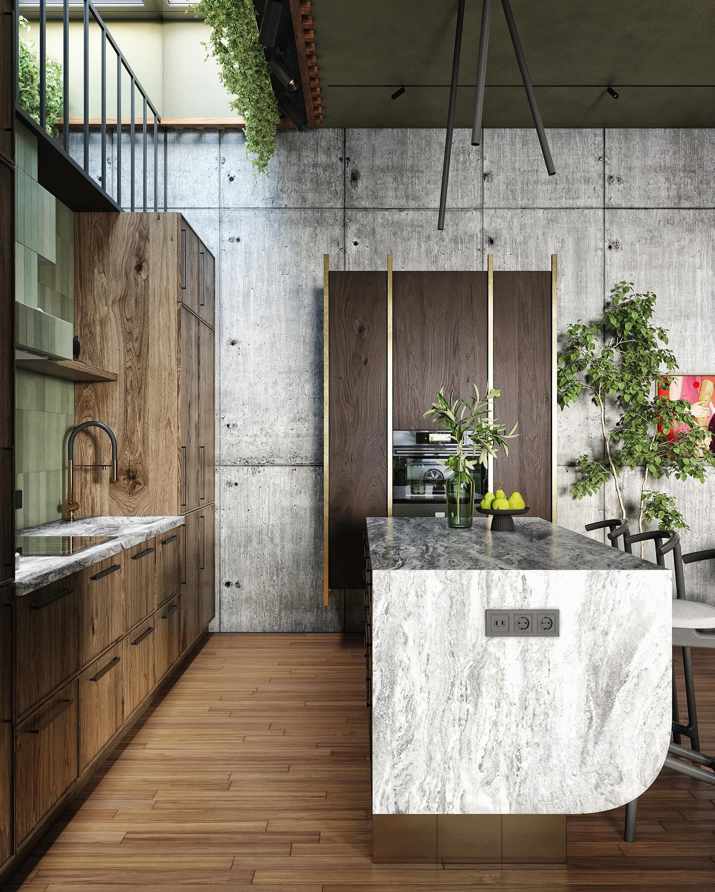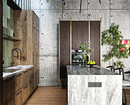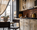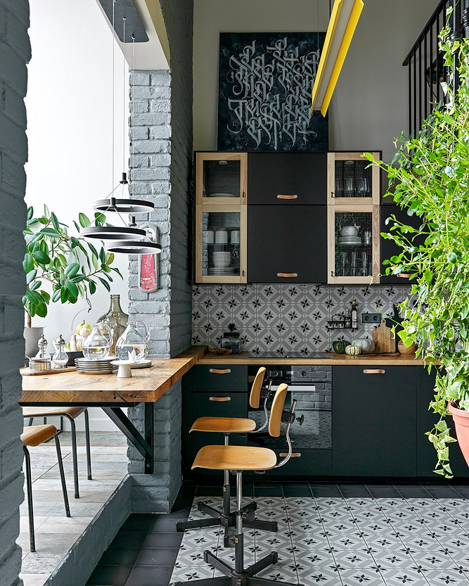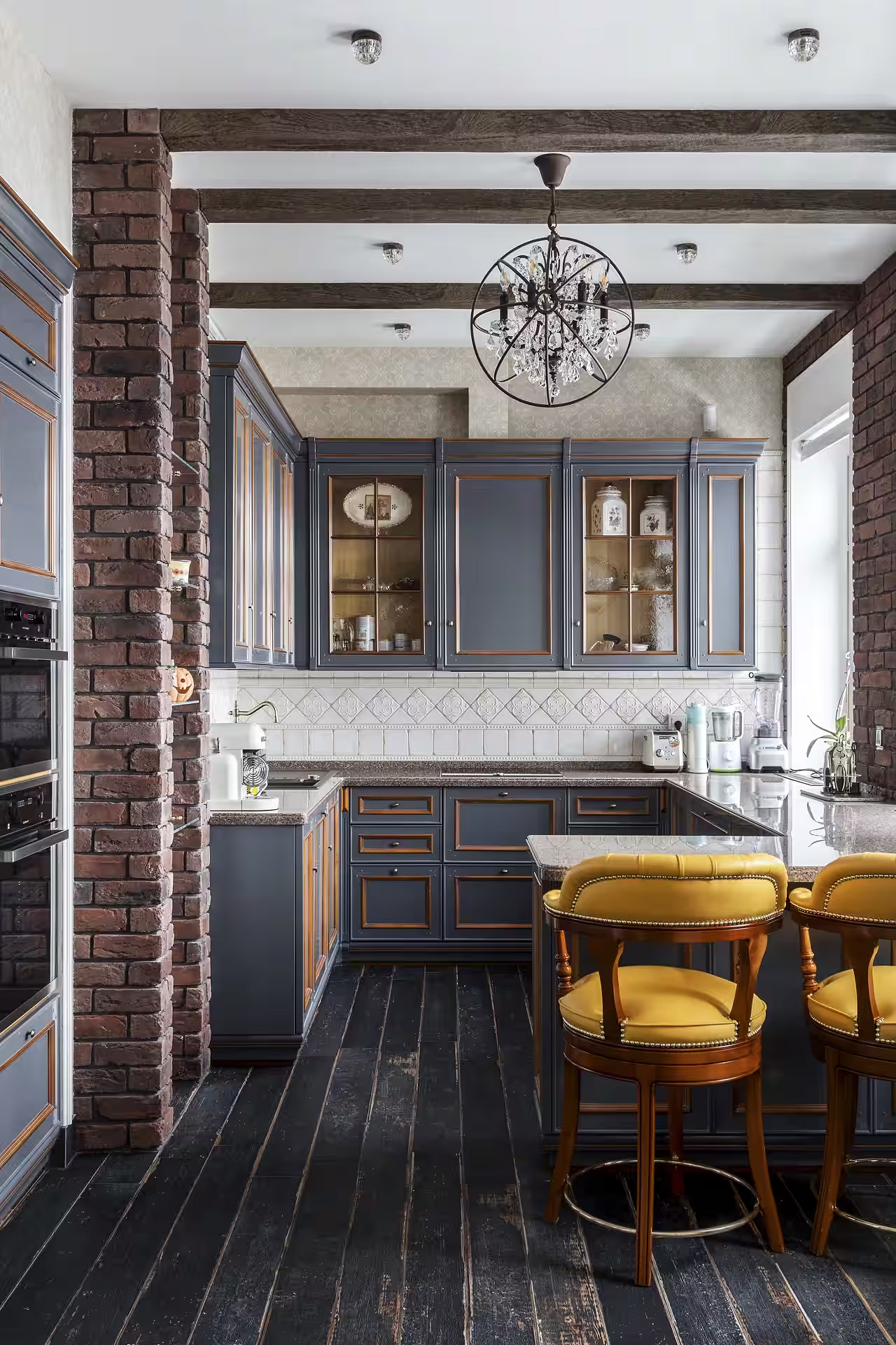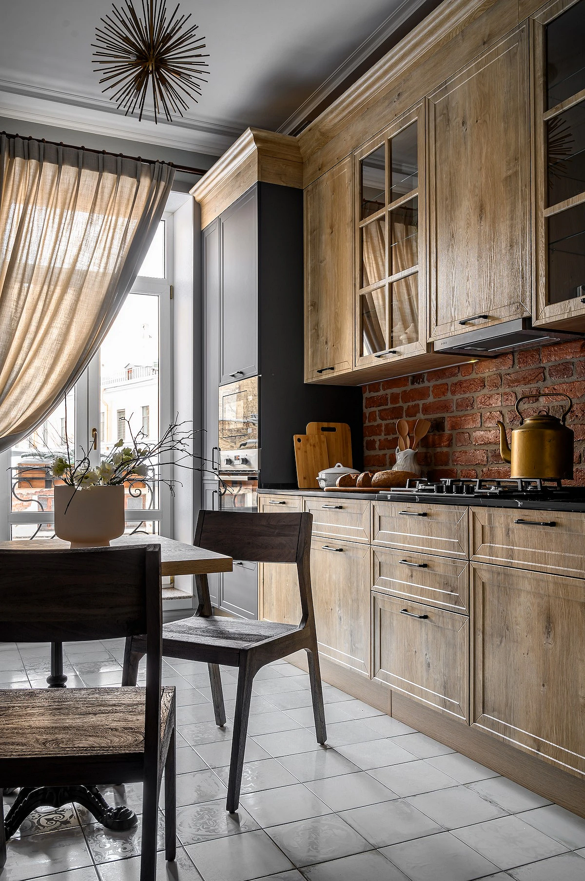 Фартук может быть из состаренной плитки, микроцемента или необработанного кирпича. Обеденная группа — чаще всего деревянная с металлическими деталями. Столешницу важно выбрать устойчивую к влаге и механическим повреждениям, в идеале — с фактурой камня или бетона.