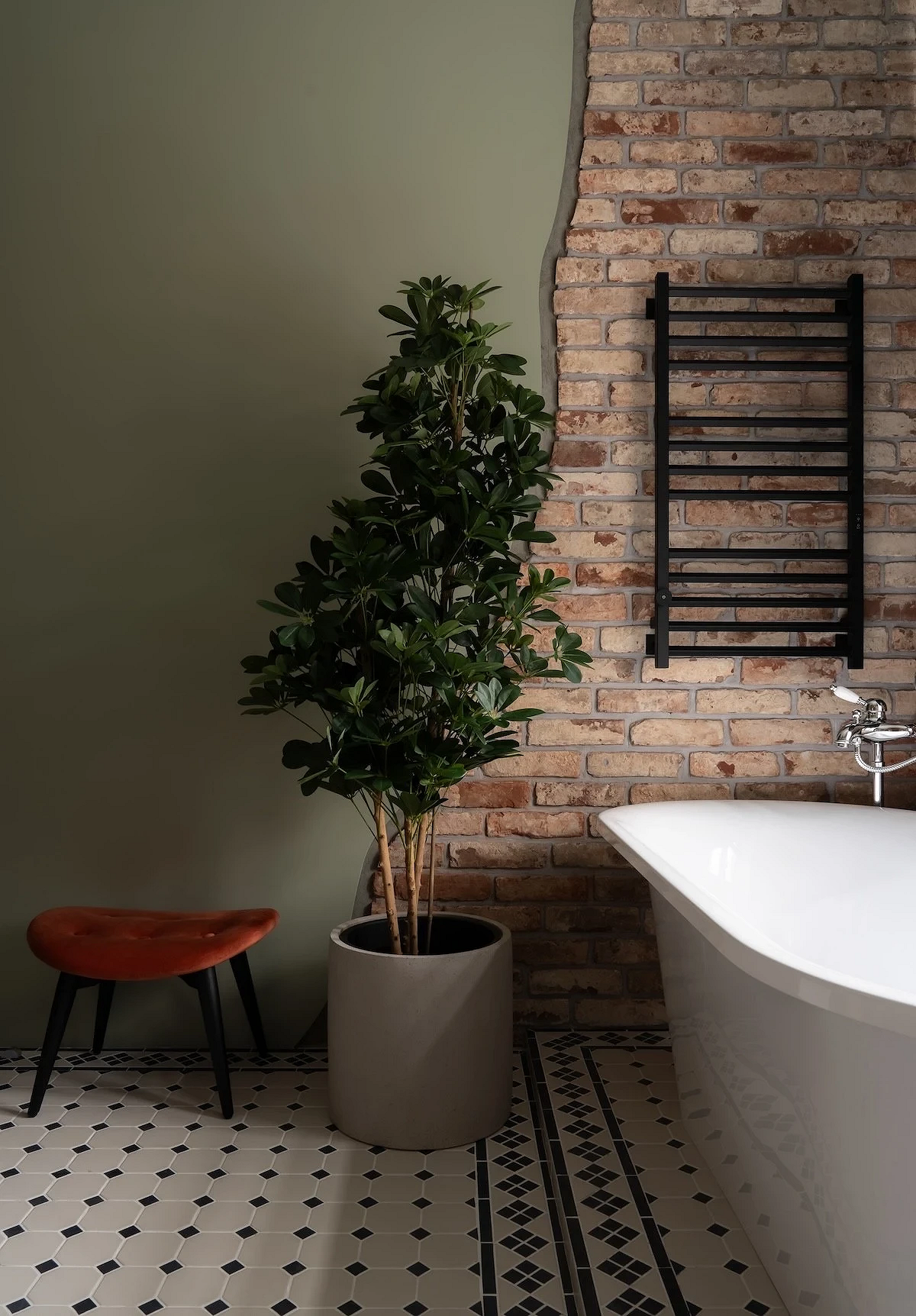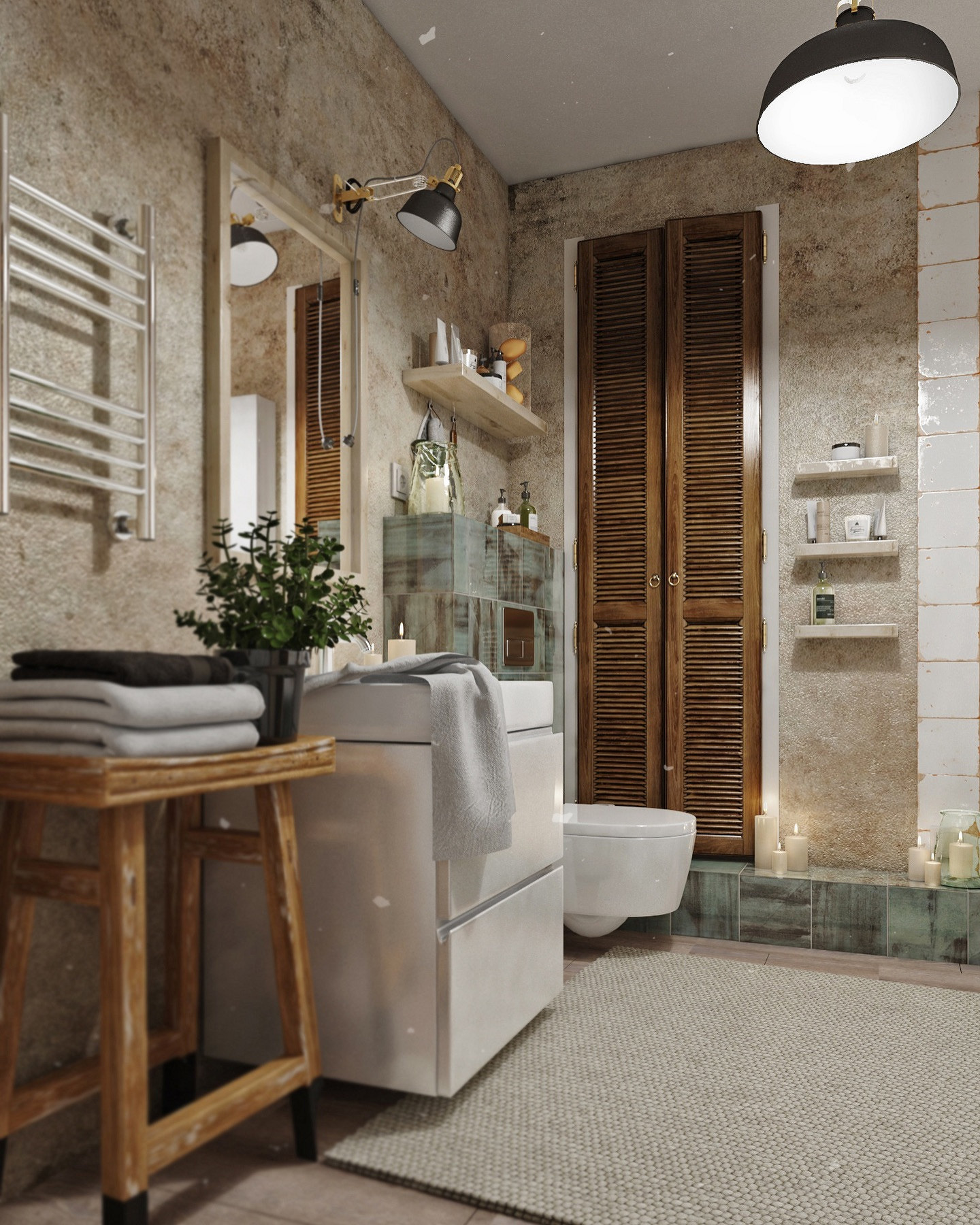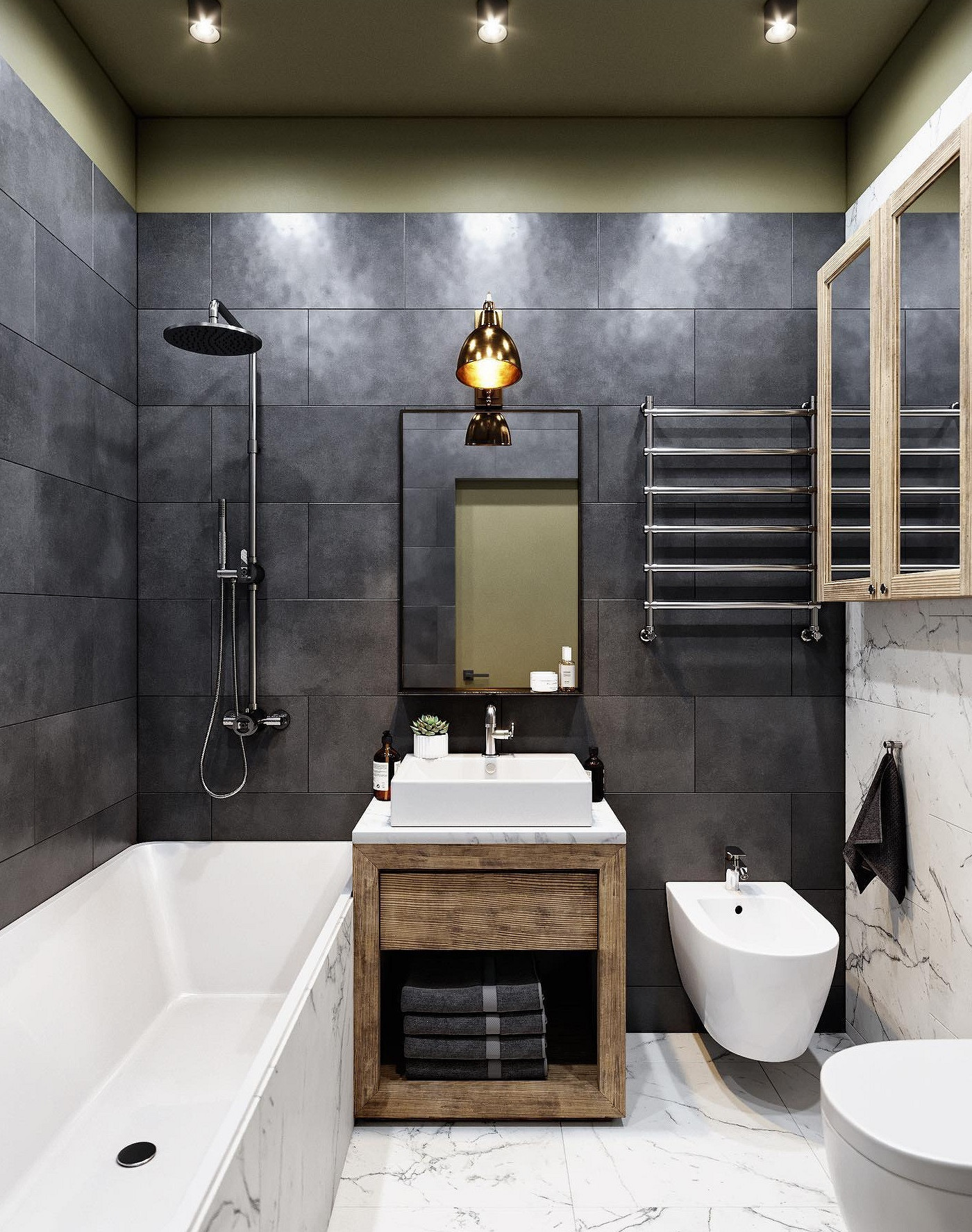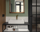 В ванной комнате гранжевого эффекта проще всего добиться через контрастные фактуры и отдельные предметы. Для отделки обычно выбирают керамогранит или плитку с имитацией натурального покрытия вроде камня или дерева (либо искусственно состаренные). Не в мокрых зонах уместны микроцемент, влагостойкие обои или краска. Хорошо работает комбинация материалов — двух или трех в зависимости от площади санузла.