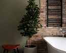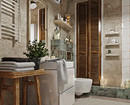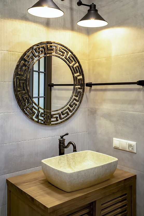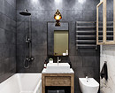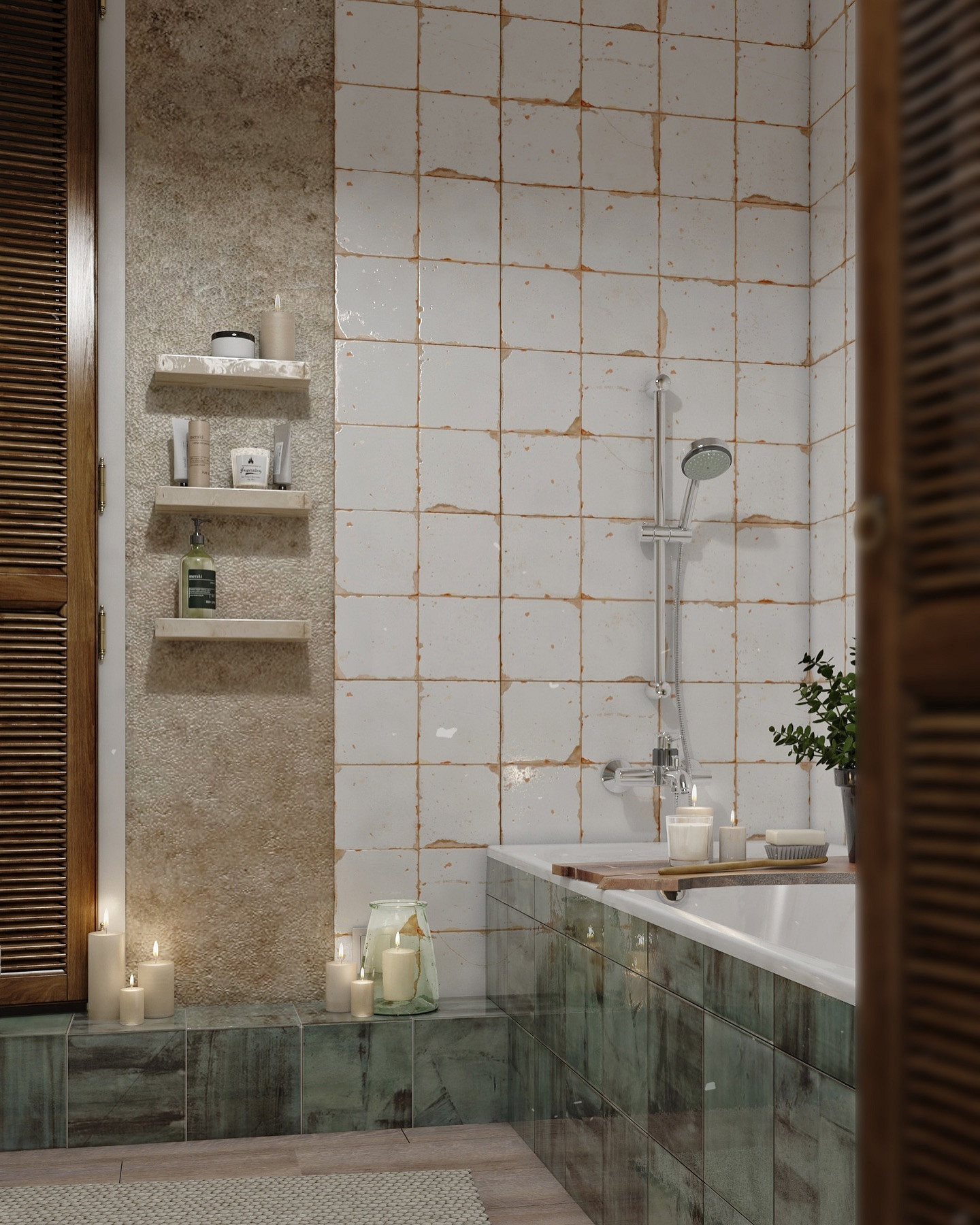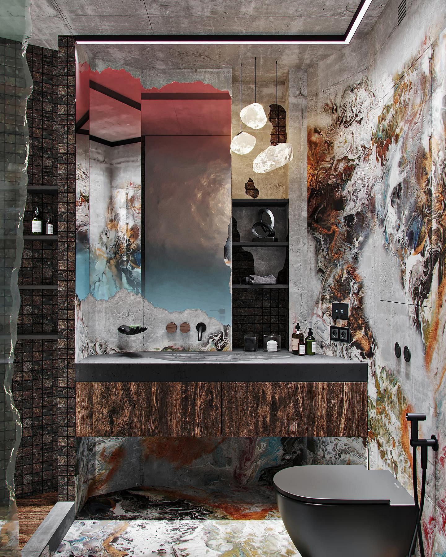 В ванной комнате гранжевого эффекта проще всего добиться через контрастные фактуры и отдельные предметы. Для отделки обычно выбирают керамогранит или плитку с имитацией натурального покрытия вроде камня или дерева (либо искусственно состаренные). Не в мокрых зонах уместны микроцемент, влагостойкие обои или краска. Хорошо работает комбинация материалов — двух или трех в зависимости от площади санузла.