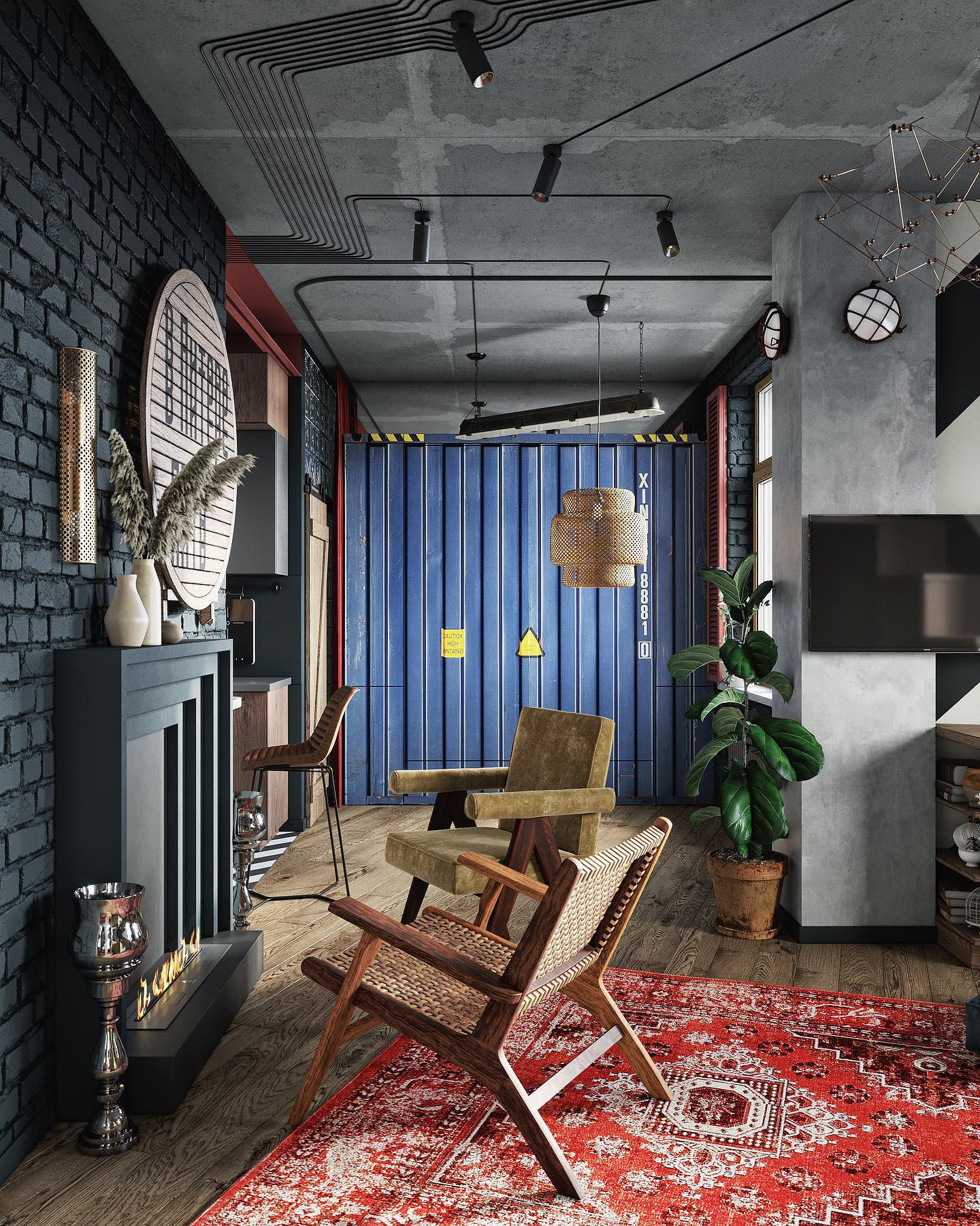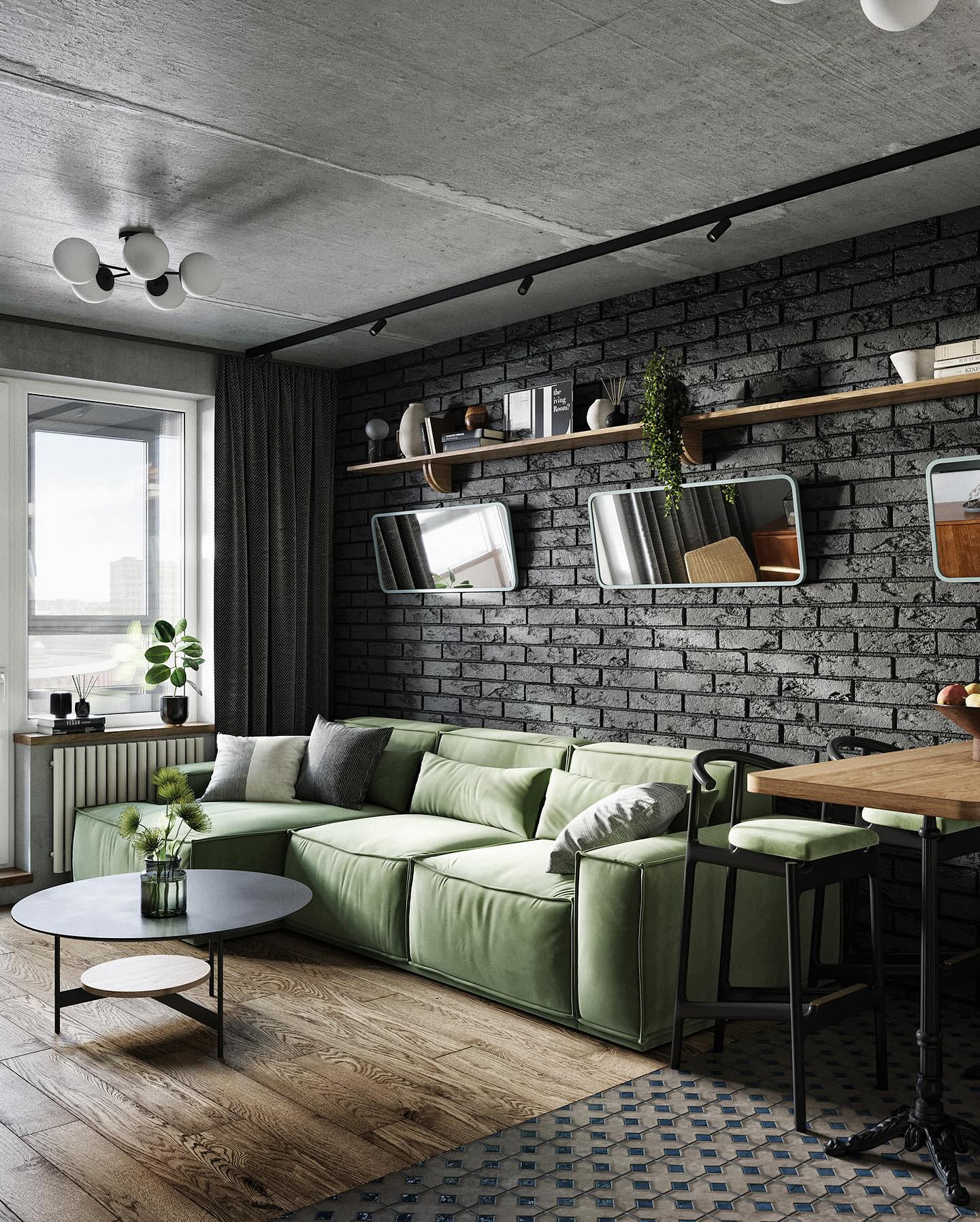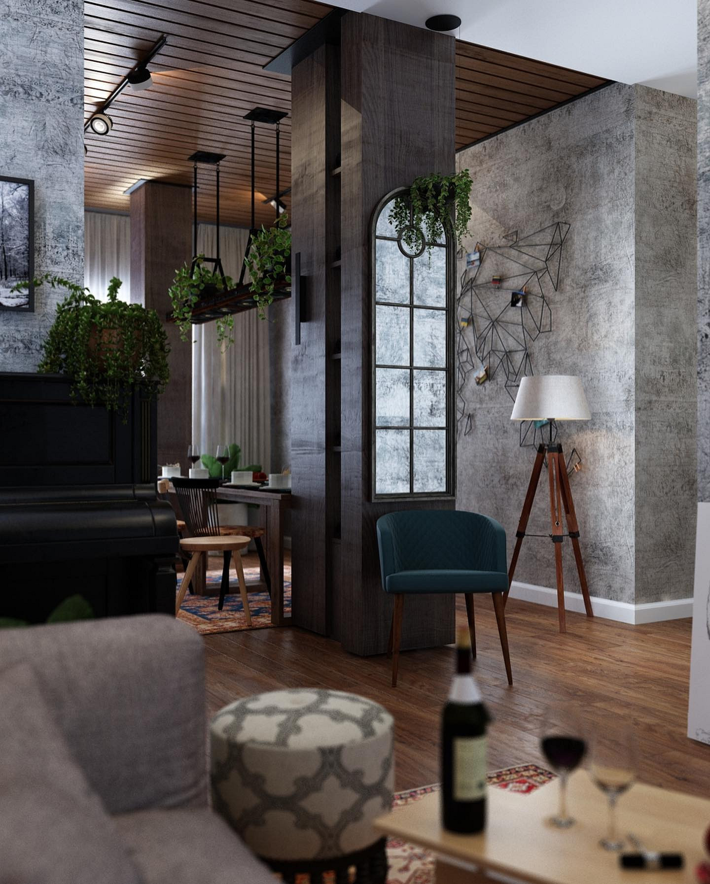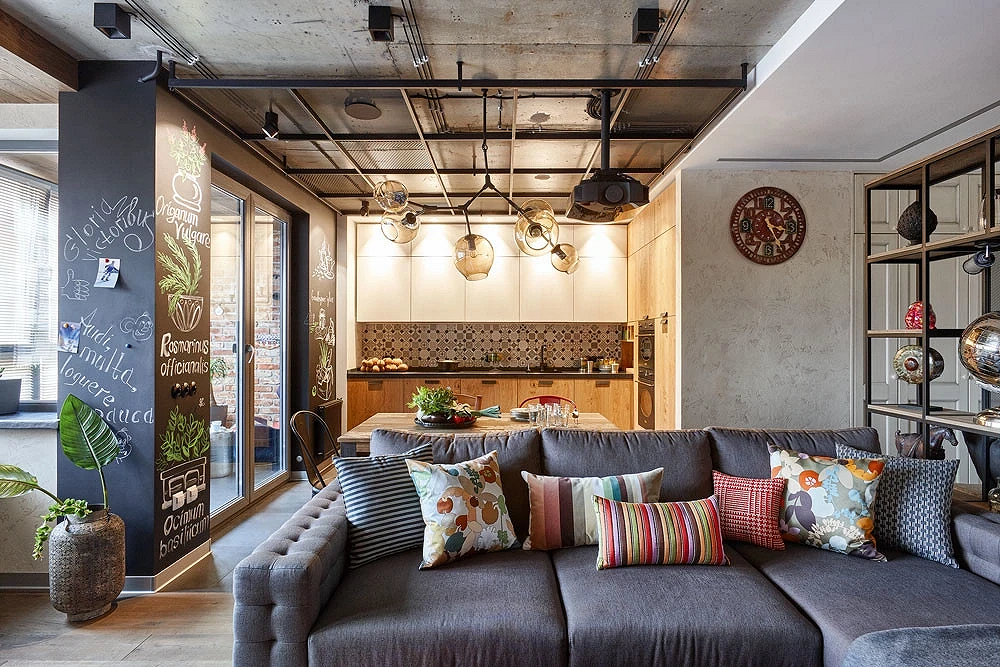 Такой дизайн лучше всего выглядит в просторном помещении, не всегда его можно реализовать в маленькой квартире. Если размеры комнаты подходят, но света недостаточно, обязательно компенсируйте этот недостаток искусственным светом. Так как отделка довольно грубая, для того чтобы по вечерам интерьер выглядел уютно, используйте светильники с рассеянным теплым светом. Распределяйте их по всей комнате, чтобы избежать ощущения мрачных темных углов.