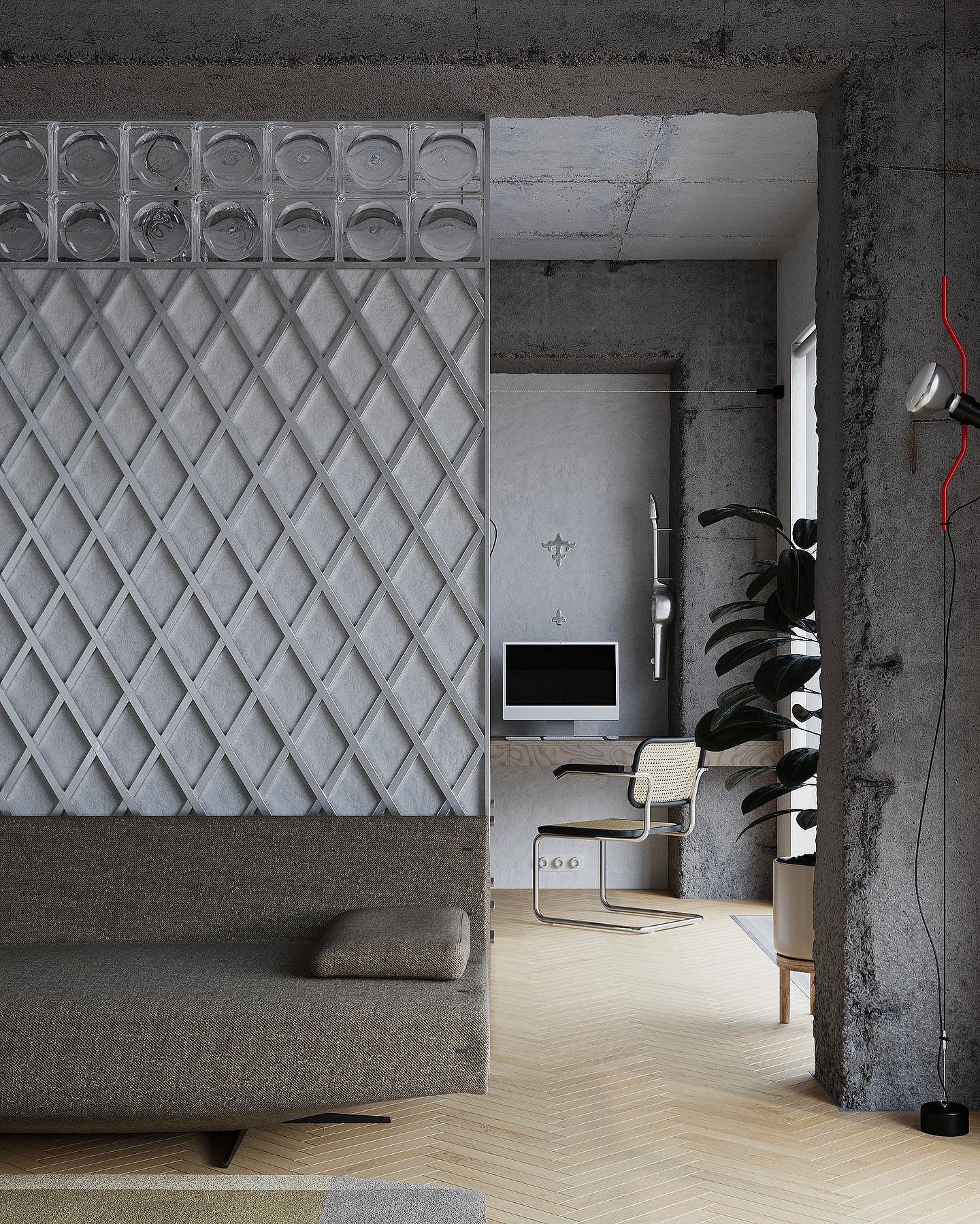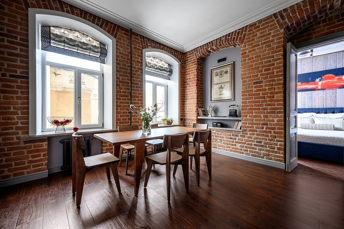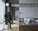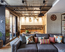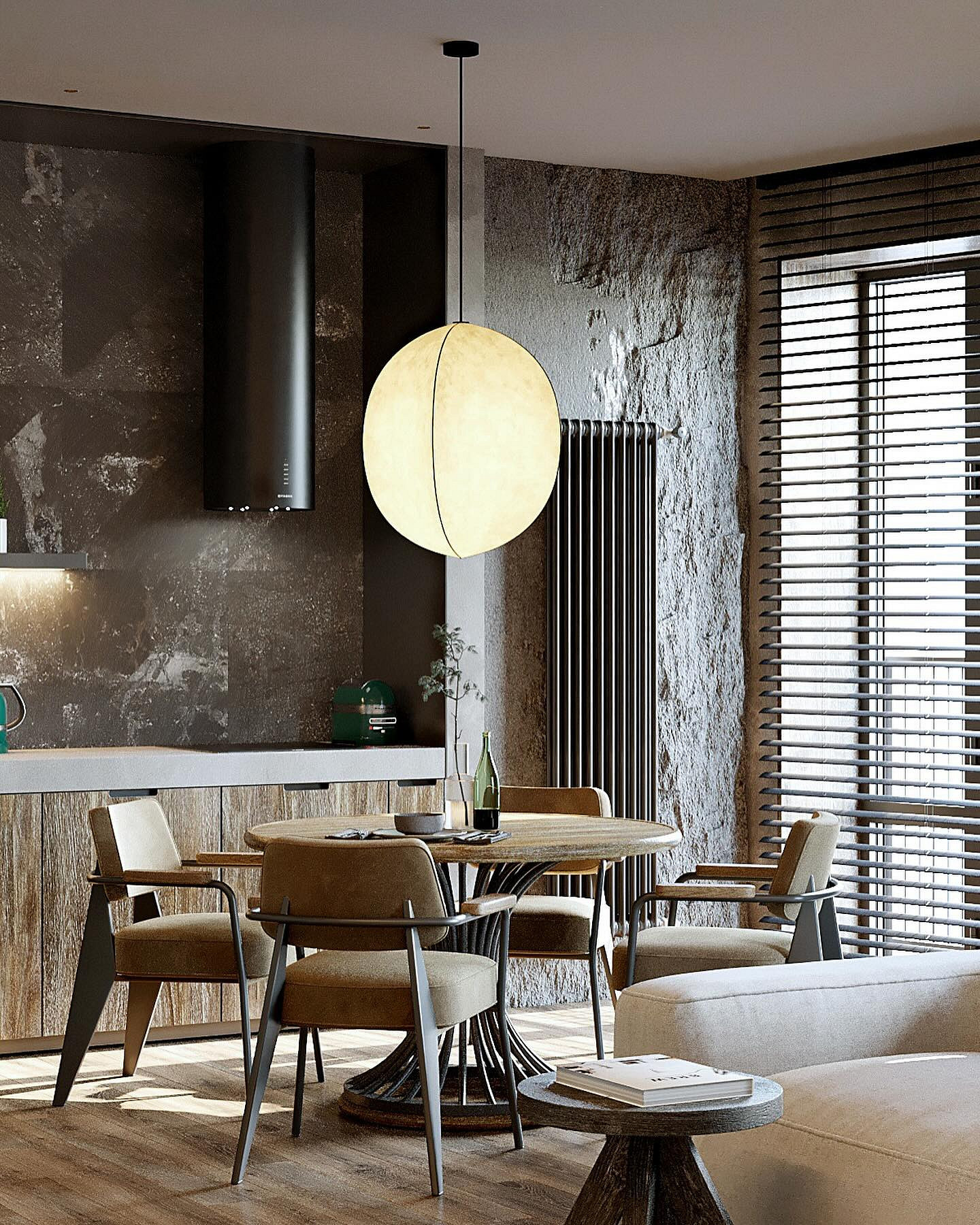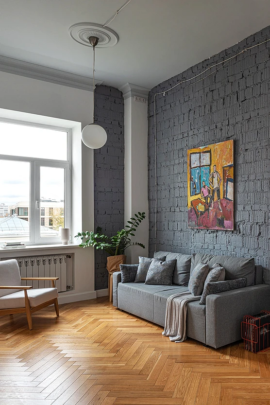 Такой дизайн лучше всего выглядит в просторном помещении, не всегда его можно реализовать в маленькой квартире. Если размеры комнаты подходят, но света недостаточно, обязательно компенсируйте этот недостаток искусственным светом. Так как отделка довольно грубая, для того чтобы по вечерам интерьер выглядел уютно, используйте светильники с рассеянным теплым светом. Распределяйте их по всей комнате, чтобы избежать ощущения мрачных темных углов.