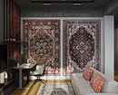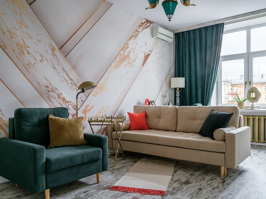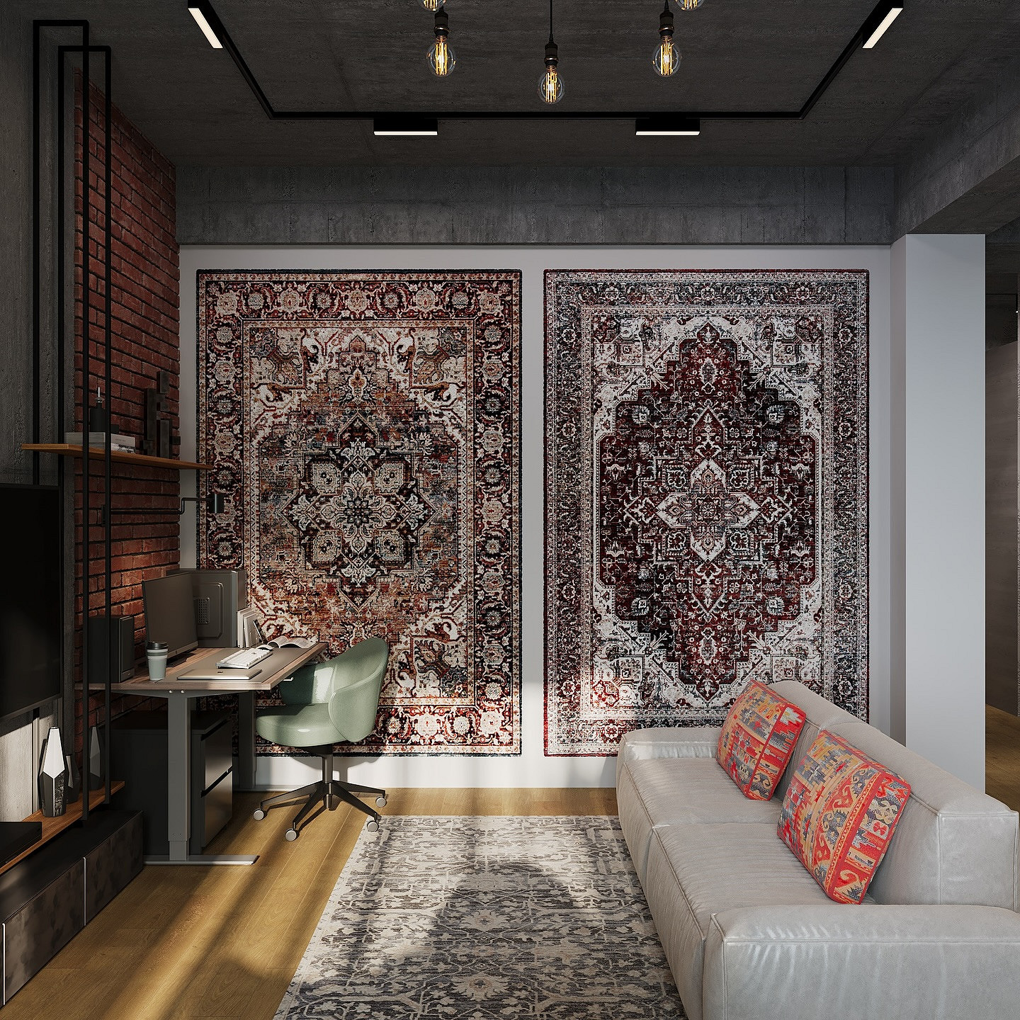 На нейтральном фоне выделите несколько ярких акцентов: например, диван или кресло, ковер с рисунком. Приправьте этот тандем небольшим количеством металлических деталей и украшений, светильников, рам для фотографий. Важно, чтобы это была не позолота или блестящий хром, а что-то более брутальное, индустриальное: чугун, медь, матовые нарочито грубые фактуры.
