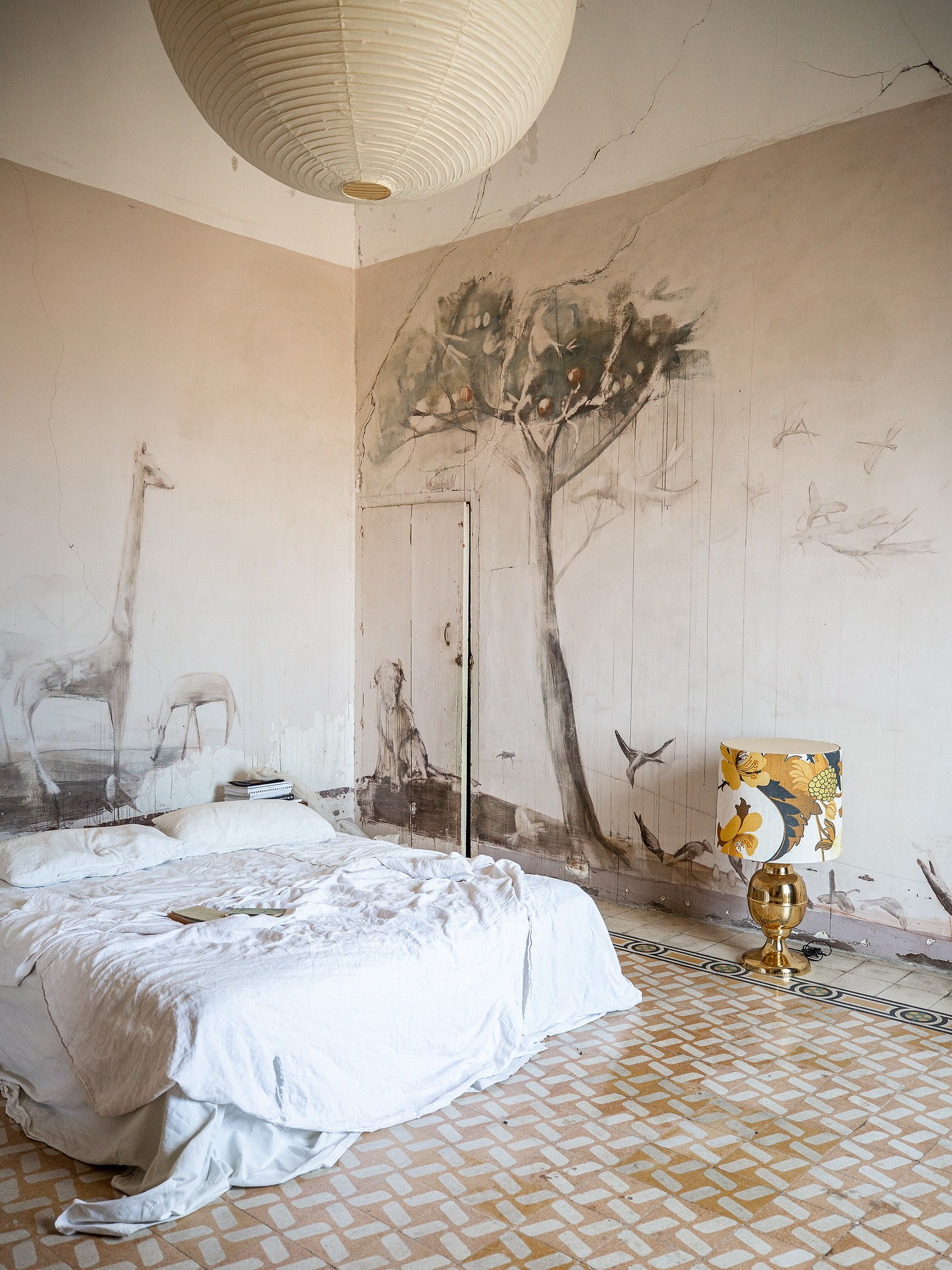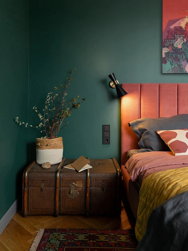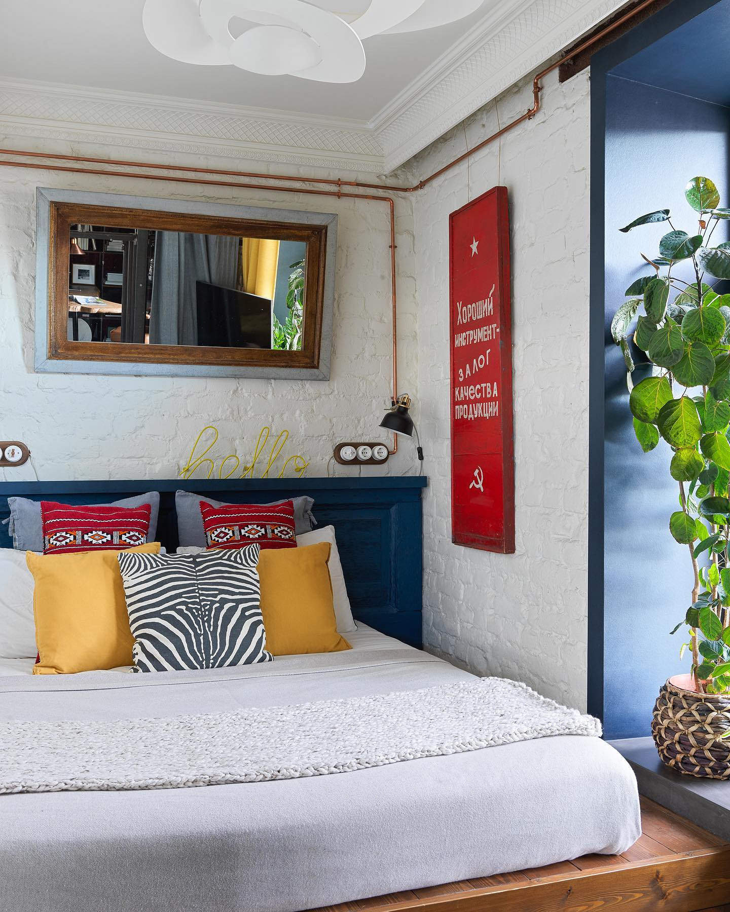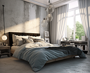 Кровать, как правило, не мягкая, а из дерева или металла, с крупным каркасом, возможно, кованым изголовьем. Постельное белье поддерживает общую атмосферу, отлично смотрятся комплекты изо льна или хлопка без ярких узоров. Обстановку дополняют коврами, винтажными зеркалами, постерами и картинами, фотографиями, растениями в кашпо.