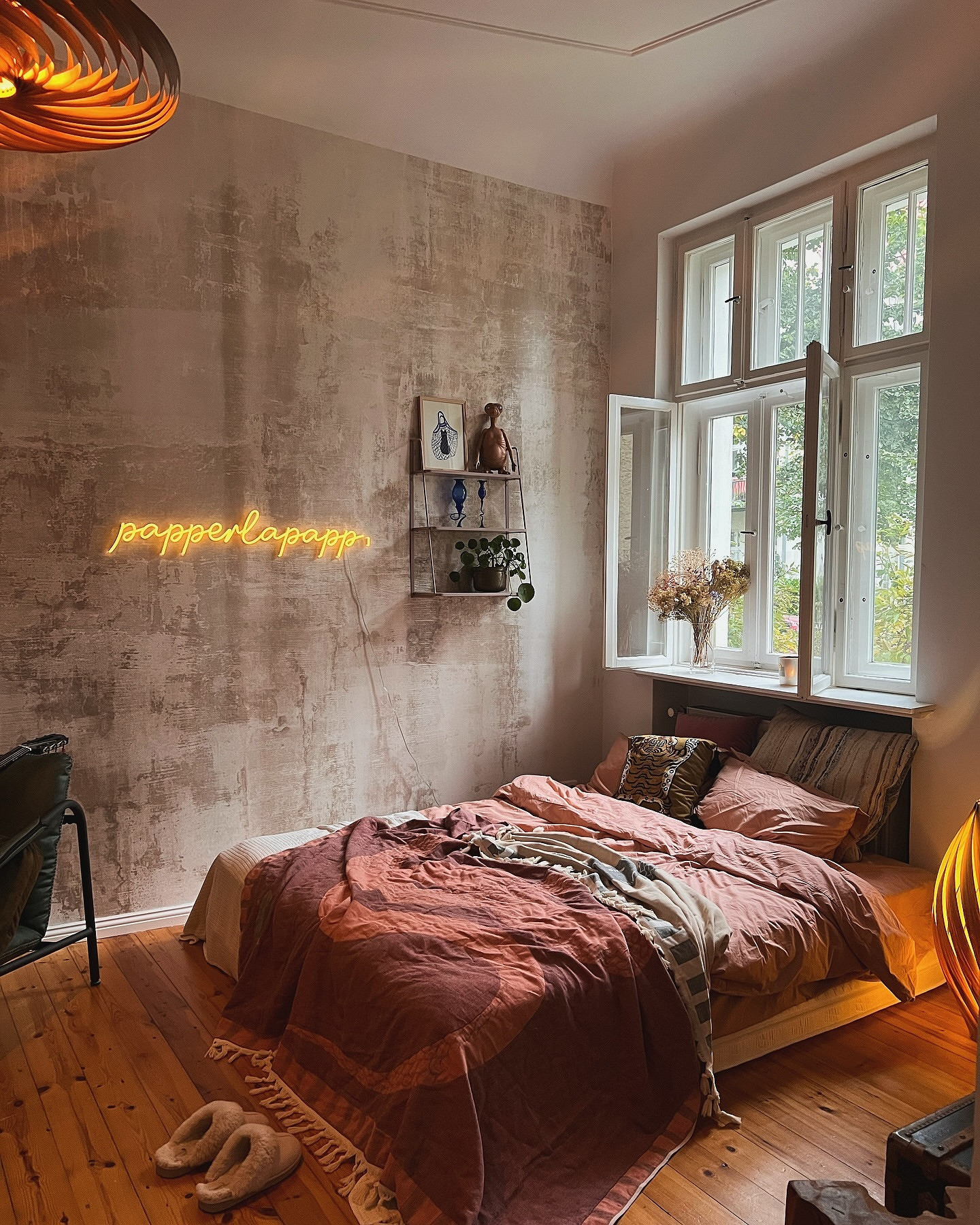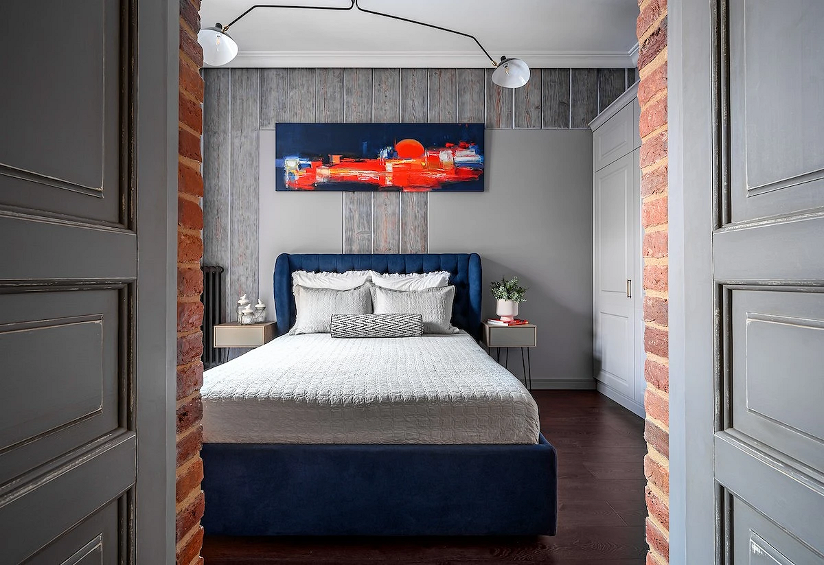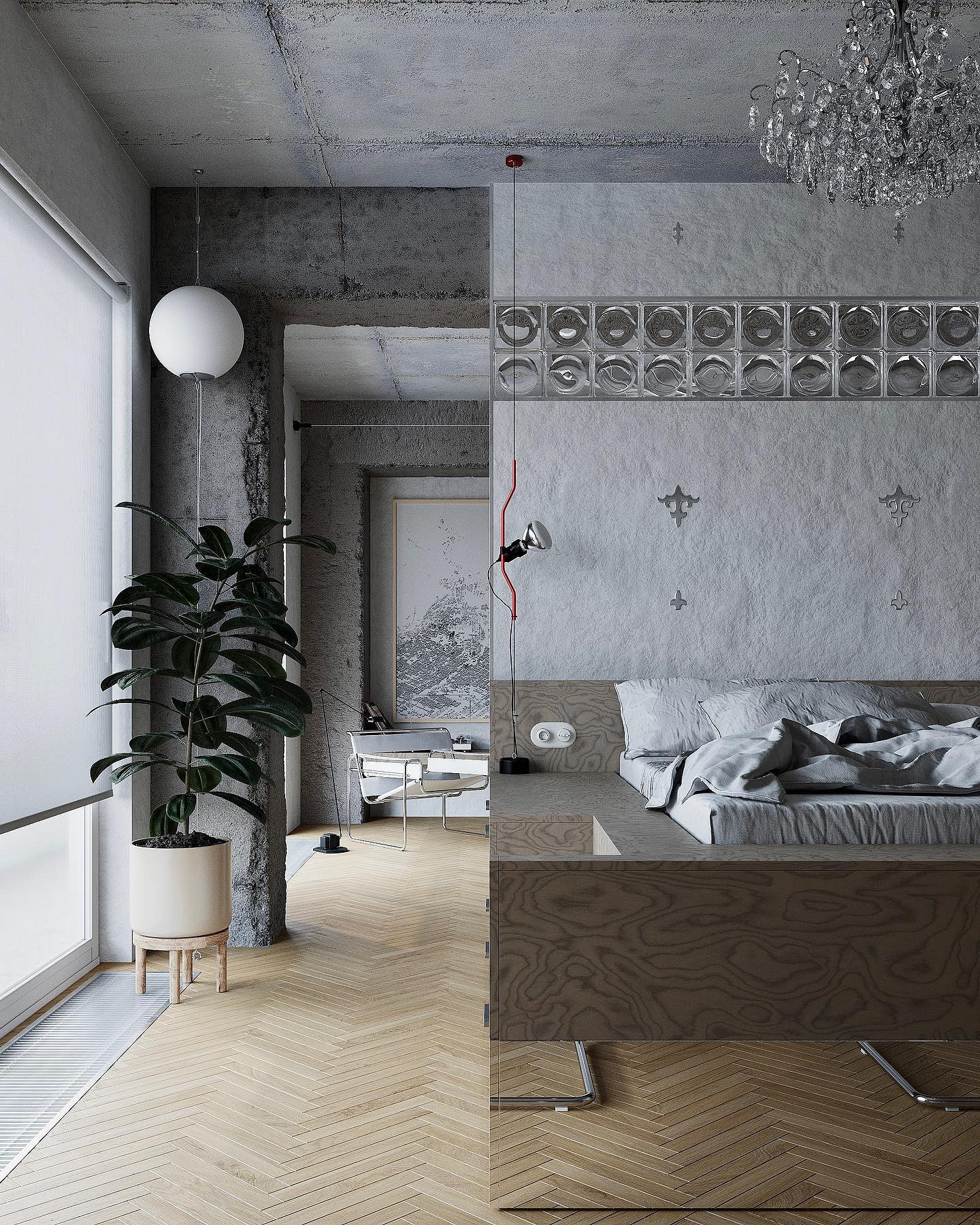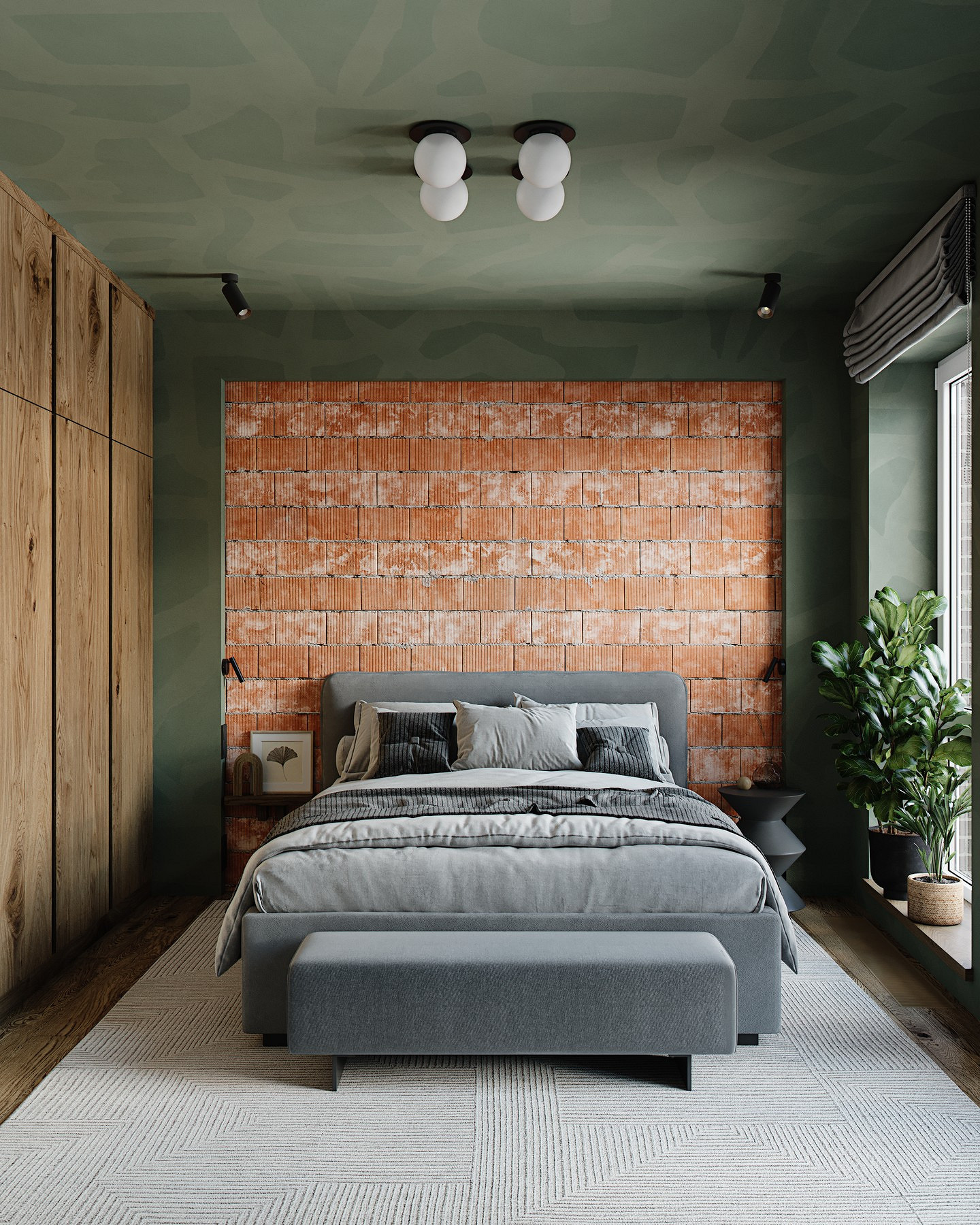 Спальня в стиле гранж выглядит по-особенному уютно. Основная идея — сочетать грубоватые фактуры, крупную мебель и это уют через фактуру. Как и в гостиной, для этой комнаты тоже часто выбирают рельефную отделку вроде кирпича, бетона или штукатурки с каким-либо эффектом. Но если в основе лежит софт-минимализм, оформление может быть и более свободным.