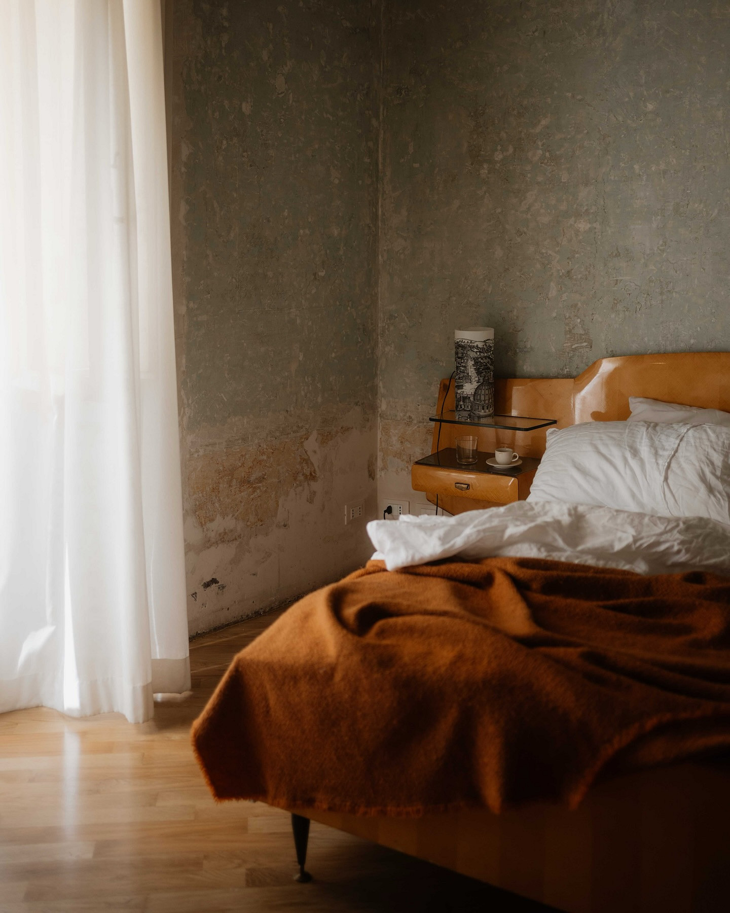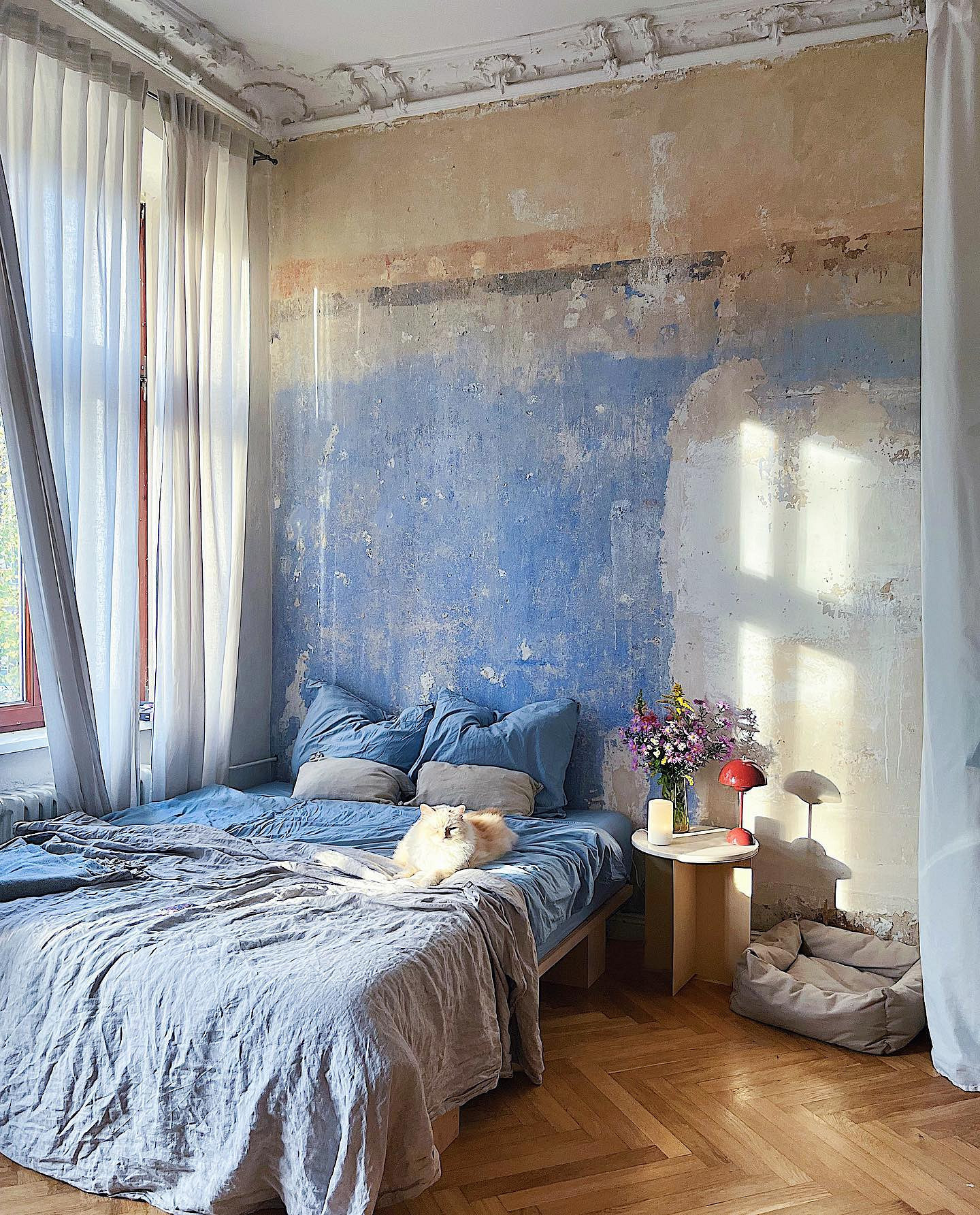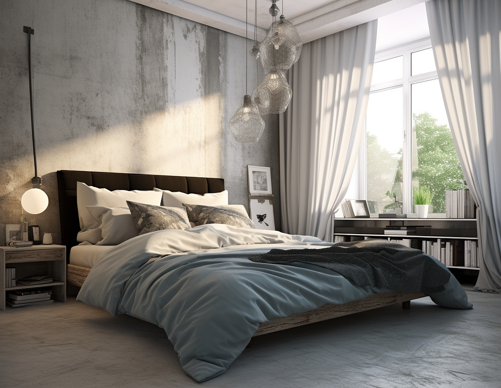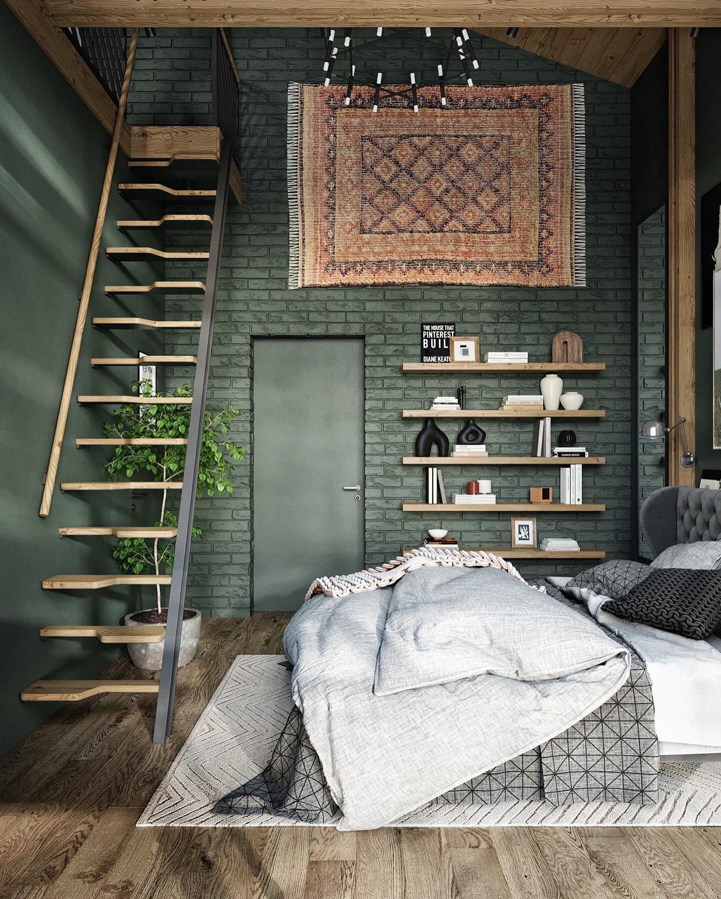 Спальня в стиле гранж выглядит по-особенному уютно. Основная идея — сочетать грубоватые фактуры, крупную мебель и это уют через фактуру. Как и в гостиной, для этой комнаты тоже часто выбирают рельефную отделку вроде кирпича, бетона или штукатурки с каким-либо эффектом. Но если в основе лежит софт-минимализм, оформление может быть и более свободным.