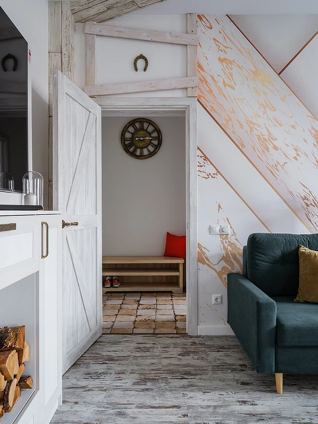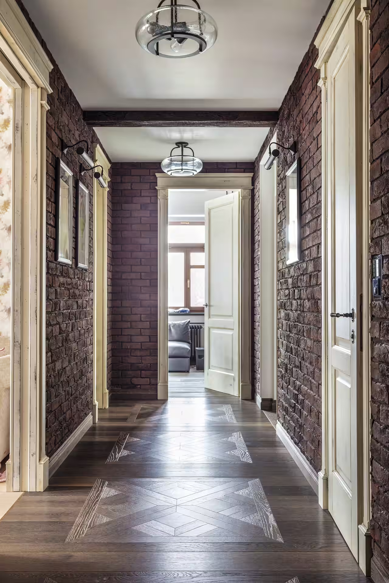 Если вы хотите оформить интерьер в этой стилистике, используйте крупную шероховатую плитку или уложите деревянный паркет с эффектом потертости. Максимально акцентируйте внимание на фактуре дерева или камня. Если массив слишком дорогой или не подходит под условия комнаты (например, на кухне или во входной зоне), его вполне можно заменить качественными аналогами вроде плитки под дерево, кварцвинила или влагостойкого ламината.