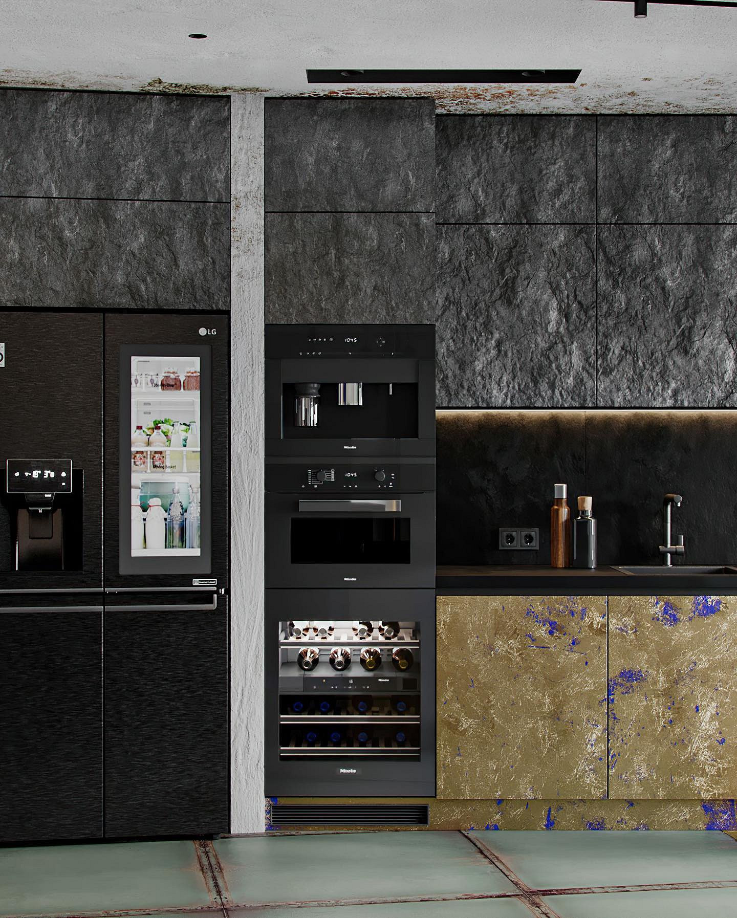На кухне стиль гранж реализуется через сочетание грубых поверхностей и современной техники. Вместо глянцевых фасадов — матовые, под бетон или дерево. Их дополнят рейлинги и стальные ручки, открытые полки, подвесные светильники в индустриальном стиле.
