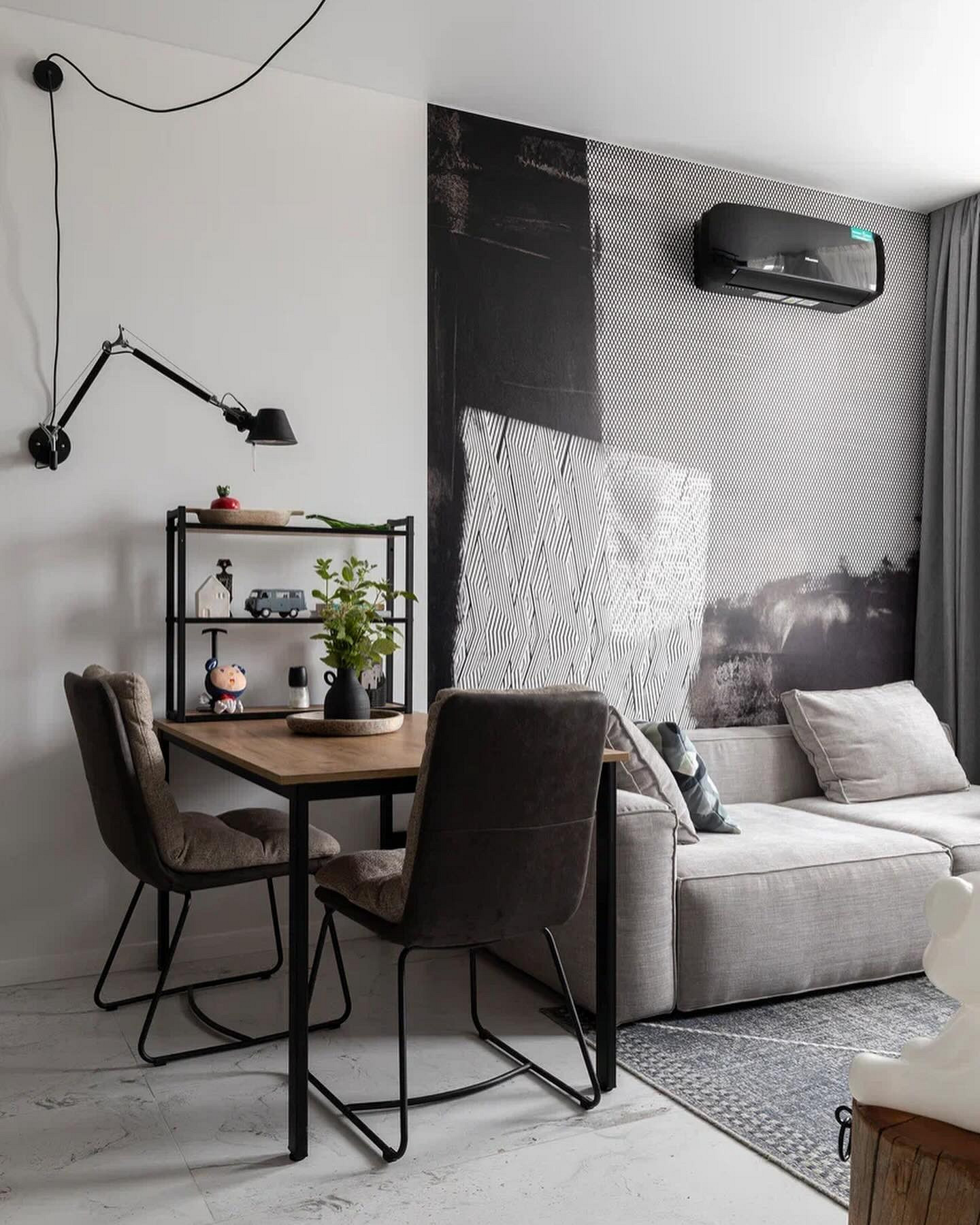 Одно из лучших сочетаний — с минимализмом. Брутальные бетонные стены и открытые коммуникации можно дополнить лаконичной мебелью нейтрального цвета — получится сдержанная обстановка с характером. Сканди-интерьеру гранжевые элементы добавляют дерзости, делают лаконичное оформление более интересным. Например, к белым стенам и светлому дереву можно «замешать» винтажную мебель, потертые ковры и металлические светильники.