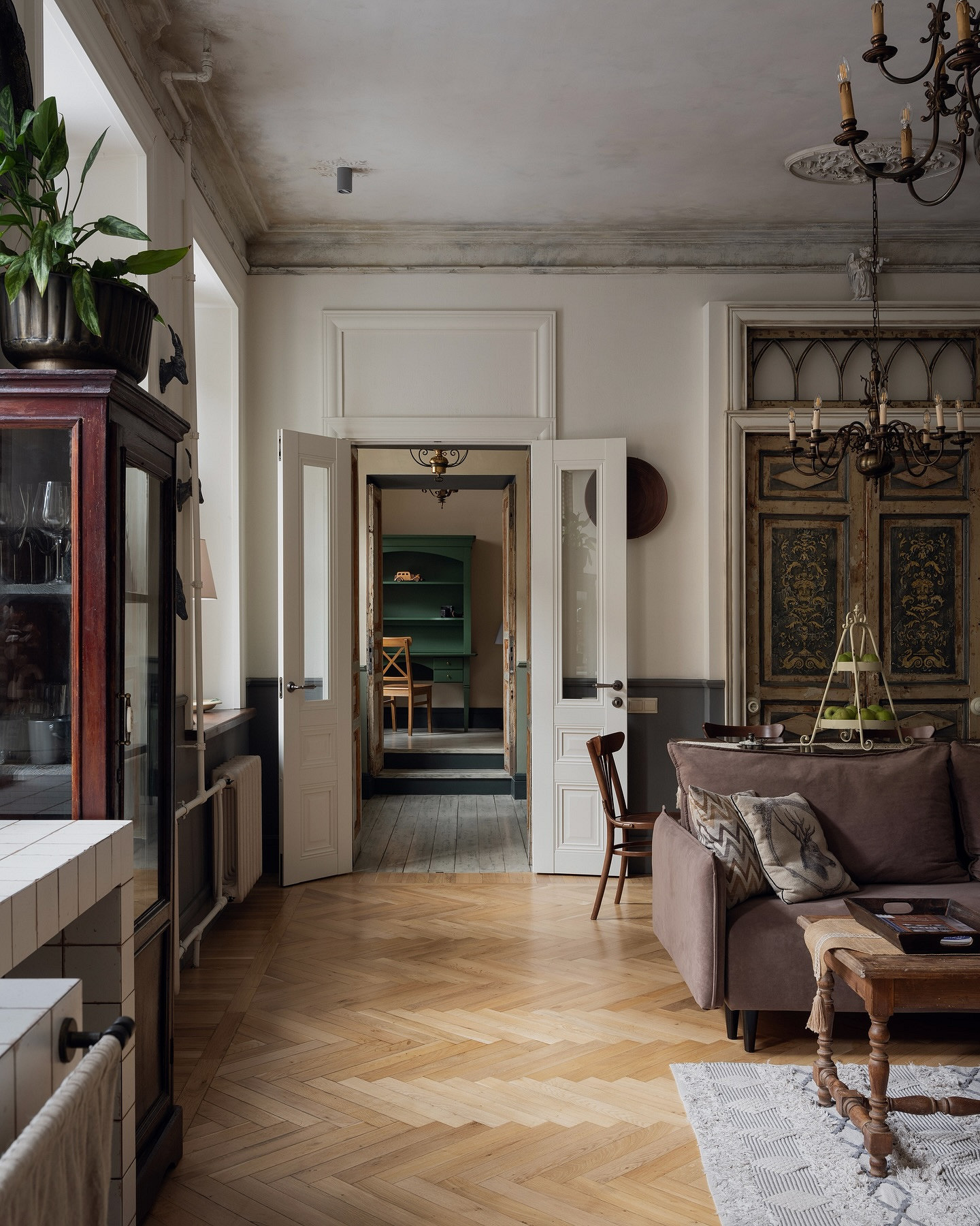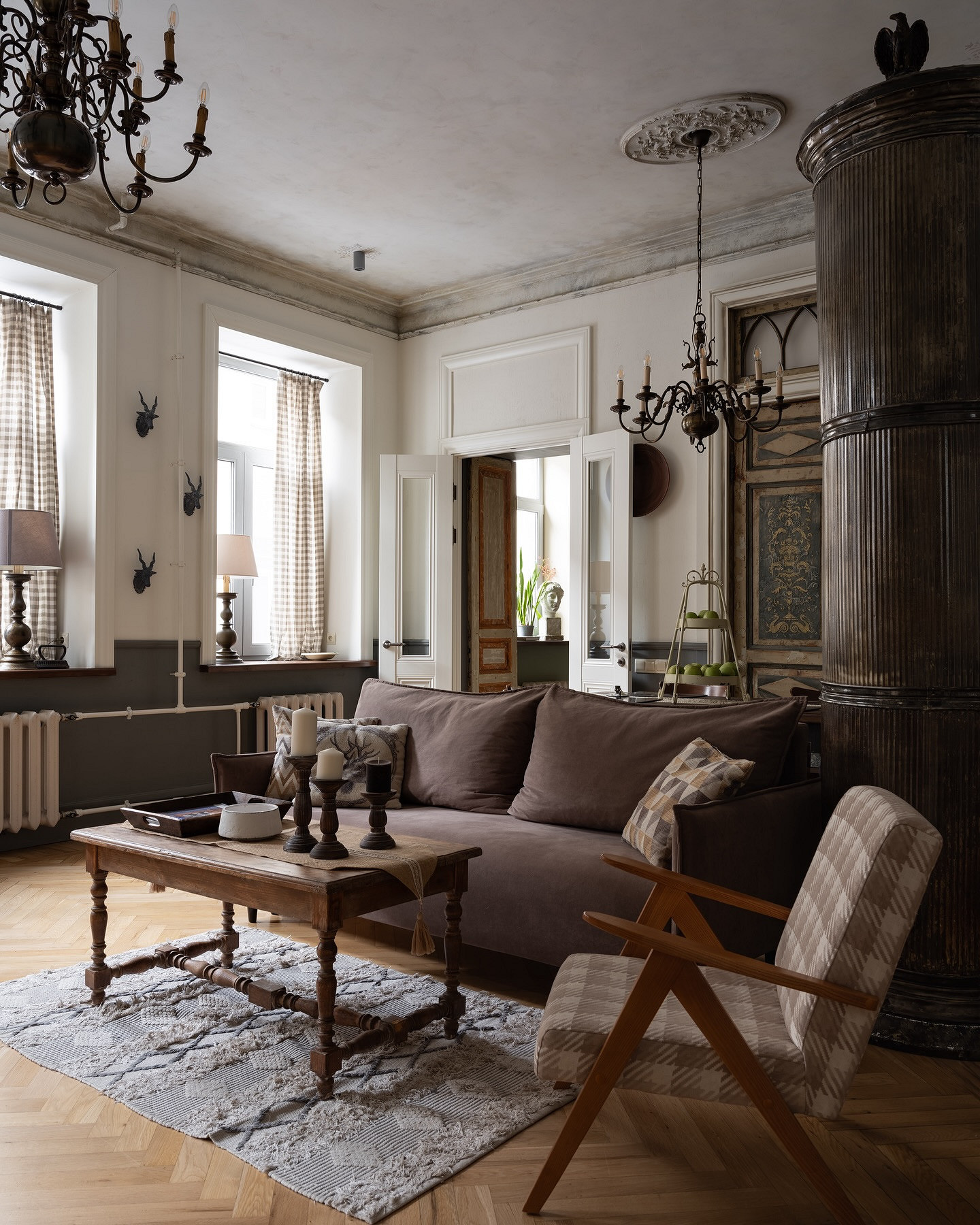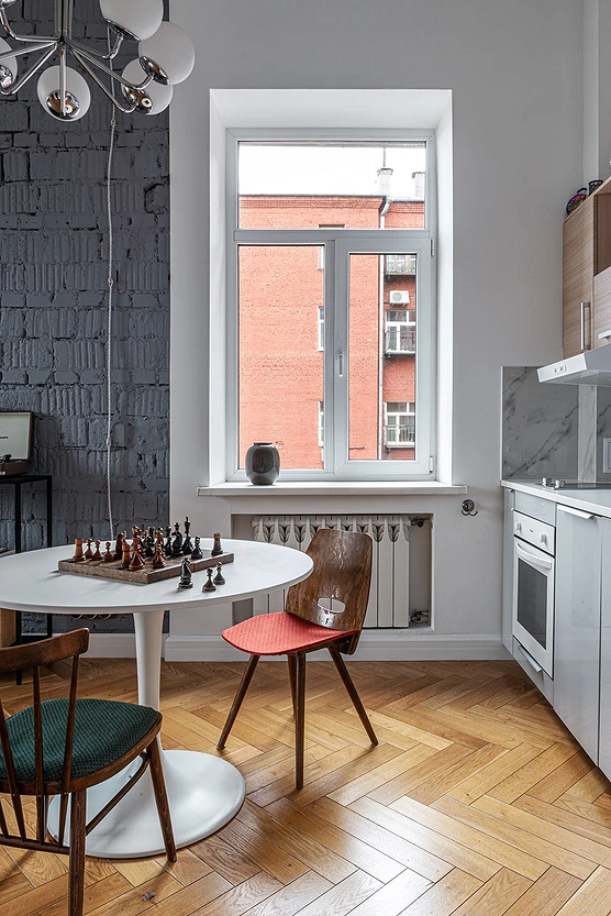 Основную роль в этом интерьере играет дневное освещение. Здорово, если в квартире или доме изначально большие окна и высокие потолки.